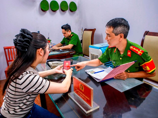 | Cán bộ, chiến sĩ công an nhân dân hướng dẫn người dân cài đặt VNeID _Nguồn: nhiepanhdoisong.vn |
