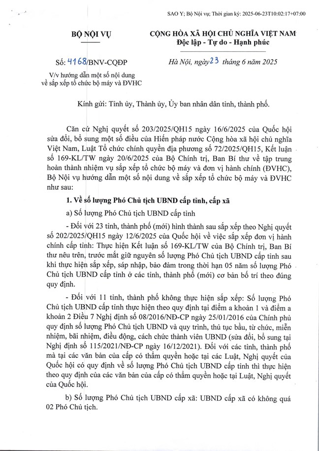 Toàn văn: Công văn 4168/BNV-CQĐP hướng dẫn một số nội dung về sắp xếp tổ chức bộ máy và đơn vị hành chính