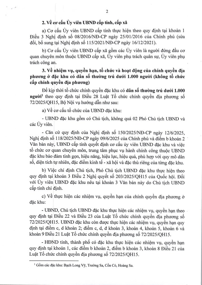 d) Trên cơ sở thực hiện chính quyền địa phương 2 cấp từ ngày 01/7/2025 theo Luật Tổ chức chính quyền địa phương số 72/2025/QH15, các văn bản của cấp có thẩm quyền, Ban Chỉ đạo Trung ương và các cơ quan Trung ương liên quan; từ thực tiễn địa phương, Bộ Nội vụ sẽ tham mưu Chính phủ ban hành Nghị định quy định nhiệm vụ, quyền hạn, tổ chức và hoạt động của UBND, Chủ tịch UBND, cơ quan chuyên môn, tổ chức hành chính khác thuộc UBND đặc khu có dân số thường trú dưới 1.000 người.