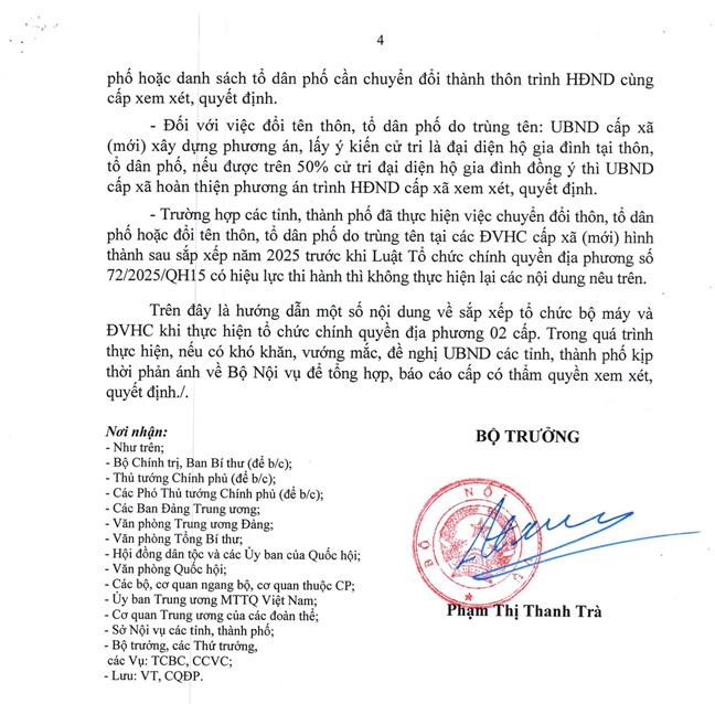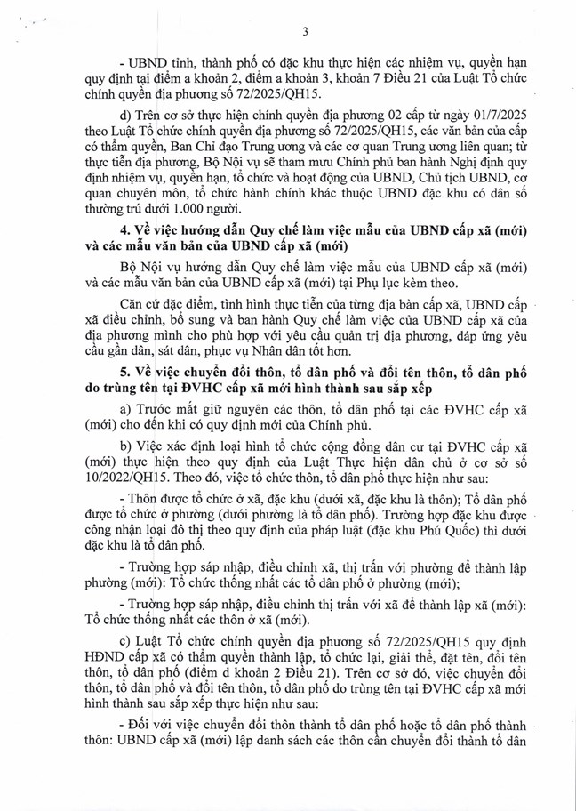 - Trường hợp các tỉnh, thành phố đã thực hiện việc chuyển đổi thôn, tổ dân phố hoặc đổi tên thôn, tổ dân phố do trùng tên tại các đơn vị hành chính cấp xã (mới) hình thành sau sắp xếp năm 2025 trước khi Luật Tổ chức chính quyền địa phương số 72/2025/QH15 có hiệu lực thi hành thì không thực hiện lại các nội dung nêu trên.