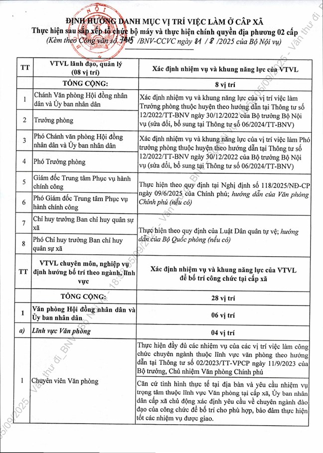 Phụ lục kèm theo Công văn số 7415 của Bộ Nội vụ đã định hướng 36 vị trí việc làm ở cấp xã, gồm: 08 vị trí lãnh đạo, quản lý, trong đó có Chánh Văn phòng, Phó Chánh Văn phòng HĐND và UBND, Trưởng phòng, Phó Trưởng phòng, Giám đốc, Phó Giám đốc Trung tâm Phục vụ hành chính công, Chỉ huy trưởng, Phó Chỉ huy trưởng Ban chỉ huy quân sự xã.