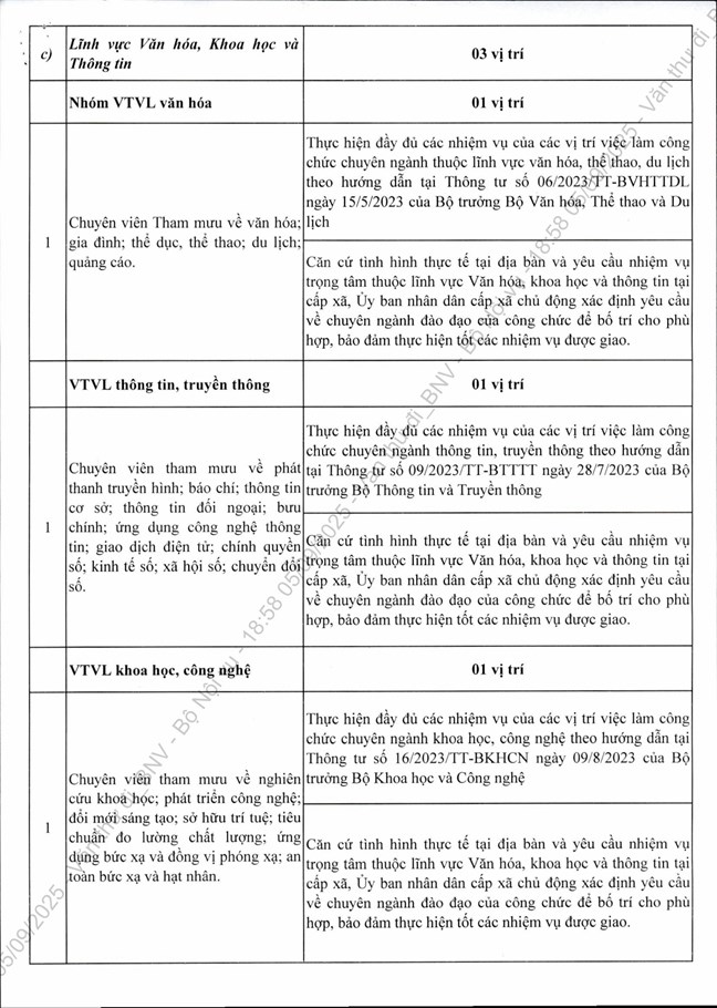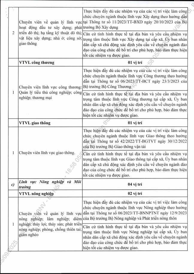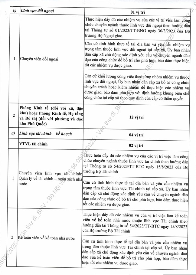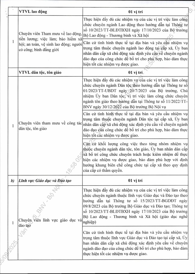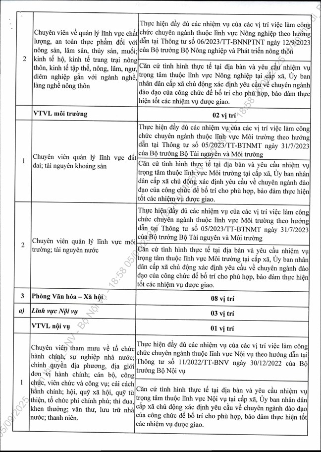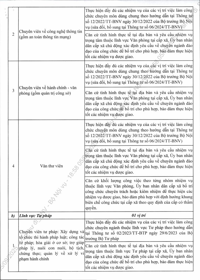 Thứ hai, để bảo đảm nhân sự tại cấp xã đáp ứng yêu cầu tổ chức chính quyền địa phương 2 cấp vận hành hiệu quả, thông suốt, đề nghị Ủy ban nhân dân các tỉnh, thành phố trực thuộc Trung ương chỉ đạo các cơ quan, tổ chức thuộc phạm vi quản lý rà soát hiện trạng việc bố trí, sử dụng công chức đáp ứng chuyên môn, nghiệp vụ theo yêu cầu về chức năng, nhiệm vụ và tạm thời định hướng danh mục vị trí việc làm tại cấp xã.