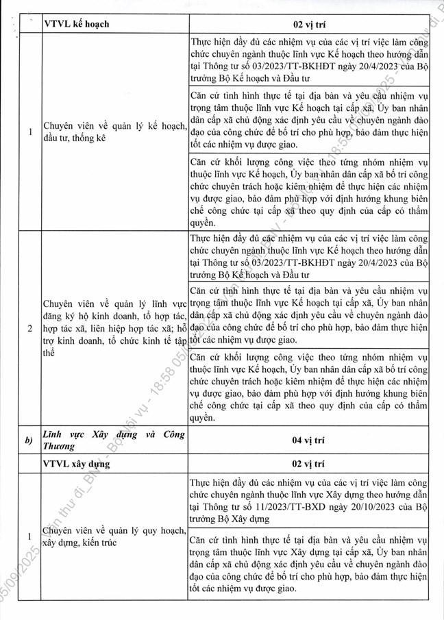 28 vị trí chuyên môn, nghiệp vụ trải rộng ở các lĩnh vực: Văn phòng, Tư pháp, Đối ngoại, Tài chính - Kế hoạch, Xây dựng – Công thương, Nông nghiệp – Môi trường, Nội vụ, Giáo dục và đào tạo, Văn hóa, Khoa học và thông tin, Y tế, Trung tâm phục vụ hành chính công, Dân quân tự vệ...
