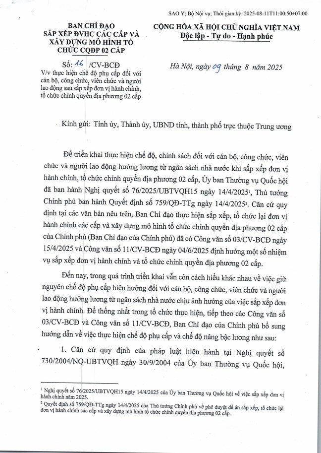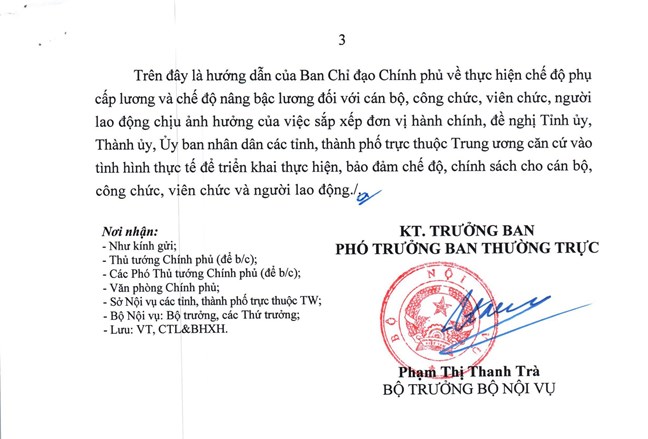 Trên đây là hướng dẫn của Ban Chỉ đạo của Chính phủ về thực hiện chế độ phụ cấp lương và chế độ nâng bậc lương đối với cán bộ, công chức, viên chức, người lao động chịu ảnh hưởng của sắp xếp đơn vị hành chính, đề nghị Tỉnh ủy, Thành ủy, Ủy ban nhân dân các tỉnh, thành phố trực thuộc Trung ương căn cứ vào tình hình thực tế để triển khai thực hiện, bảo đảm chế độ, chính sách cho cán bộ, công chức, viên chức và người lao động.