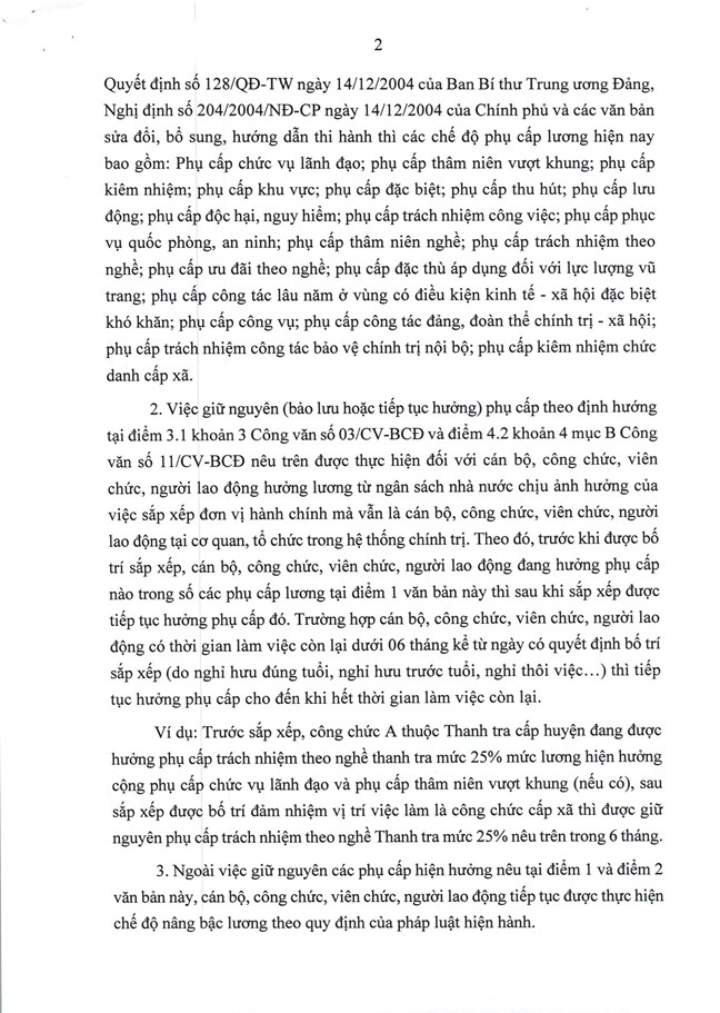 2. Việc giữ nguyên (bảo lưu hoặc tiếp tục hưởng) phụ cấp theo định hướng tại điểm 3.1 khoản 3 Công văn số 03/CV-BCĐ và điểm 4.2 khoản 4 mục B Công văn số 11/CV-BCĐ được thực hiện đối với cán bộ, công chức, viên chức, người lao động hưởng lương từ ngân sách nhà nước chịu ảnh hưởng của việc sắp xếp đơn vị hành chính mà vẫn là cán bộ, công chức, viên chức, người lao động tại cơ quan, tổ chức trong hệ thống chính trị.