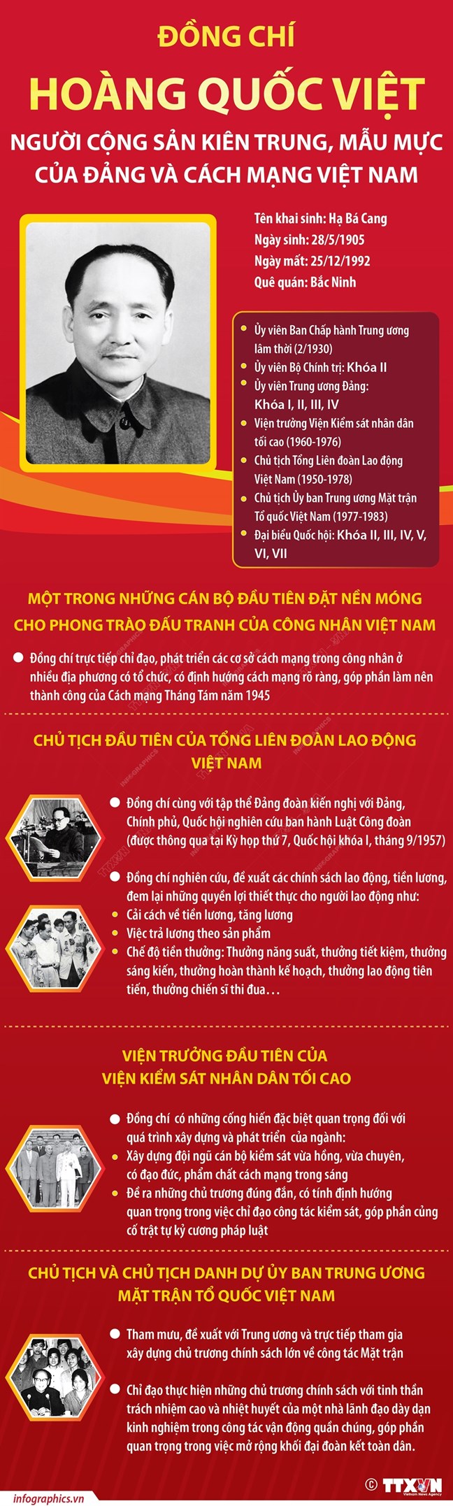 Đồng chí Hoàng Quốc Việt là một trong số rất ít nhà lãnh đạo cao cấp của Đảng liên tục giữ các cương vị lãnh đạo chủ chốt ngay từ những ngày đầu Đảng mới thành lập và cống hiến không ngơi nghỉ cho đến cuối đời. Đồng chí đã có nhiều công lao, đóng góp lớn cho Đảng, cho cách mạng Việt Nam, đặc biệt trong xây dựng, phát triển giai cấp công nhân, tổ chức công đoàn Việt Nam, với ngành kiểm sát nhân dân, với công tác Dân vận và Mặt trận của Đảng trong suốt hai cuộc kháng chiến và xây dựng chủ nghĩa xã hội.