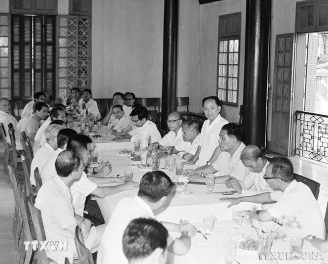 | Đồng chí Hoàng Quốc Việt, Ủy viên Ủy Ban TW Mặt trận Tổ quốc Việt Nam, Chủ tịch Tổng Công đoàn Việt Nam nói chuyện thân mật với đoàn đại biểu Việt kiều ở Pháp về thăm tổ quốc (9/1970). (Ảnh: Xuân Lâm/TTXVN) |