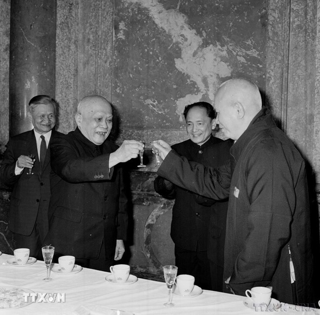 | Đồng chí Hoàng Quốc Việt, Ủy viên Ủy Ban TW Mặt trận Tổ quốc Việt Nam, Chủ tịch Tổng Công đoàn Việt Nam và Chủ tịch Tôn Đức Thắng chúc mừng thành công Đại hội Mặt trận Tổ quốc Việt Nam lần thứ III (12/1971). (Ảnh: Thế Trung/TTXVN) |