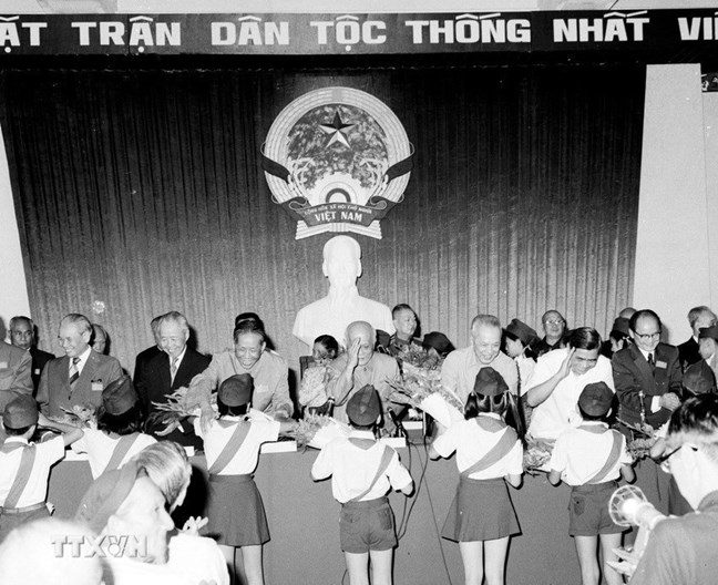 | Đại hội Mặt trận thống nhất Việt Nam được tổ chức tại Thành phố Hồ Chí Minh từ ngày 31/1 -4/2/1977, hợp nhất 3 tổ chức: Mặt trận Tổ quốc Việt Nam, Mặt trận Dân tộc Giải phóng miền Nam Việt Nam, Liên minh các lực lượng dân tộc, dân chủ và hòa bình Việt Nam, lấy tên là Mặt trận Tổ quốc Việt Nam. Đoàn Chủ tịch gồm 45 vị. Chủ tịch danh dự là đồng chí Tôn Đức Thắng; Chủ tịch là đồng chí Hoàng Quốc Việt. Trong ảnh: Thiếu nhi thành phố Hồ Chí Minh tặng hoa đoàn Chủ tịch Đại hội. (Ảnh: Kim Hùng/TTXVN) |