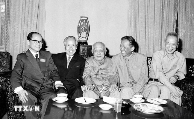 | Đồng chí Hoàng Quốc Việt (ngoài cùng, trái sang) cùng đồng chí Tôn Đức Thắng, đồng chí Lê Duẩn và các đồng Nguyễn Hữu Thọ, Trịnh Đình Thảo tại Đại hội Mặt trận thống nhất Việt Nam, được tổ chức tại TP Hồ Chí Minh từ ngày 31/1-4/2/1977. (Ảnh: Kim Hùng/TTXVN) |