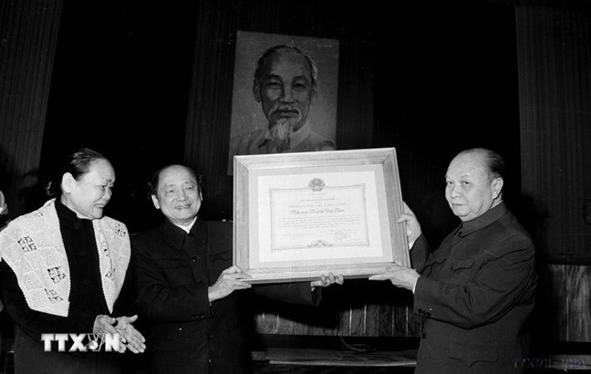 | Đồng chí Trường Chinh, Chủ tịch Uỷ ban Thường vụ Quốc hội trao tặng Huân chương Sao Vàng cho Chủ tịch Đoàn Chủ tịch Ủy ban Trung ương Mặt trận Tổ quốc Việt Nam Hoàng Quốc Việt (Hà Nội, 8/12/1980). (Ảnh: Ngọc Khanh/TTXVN) |