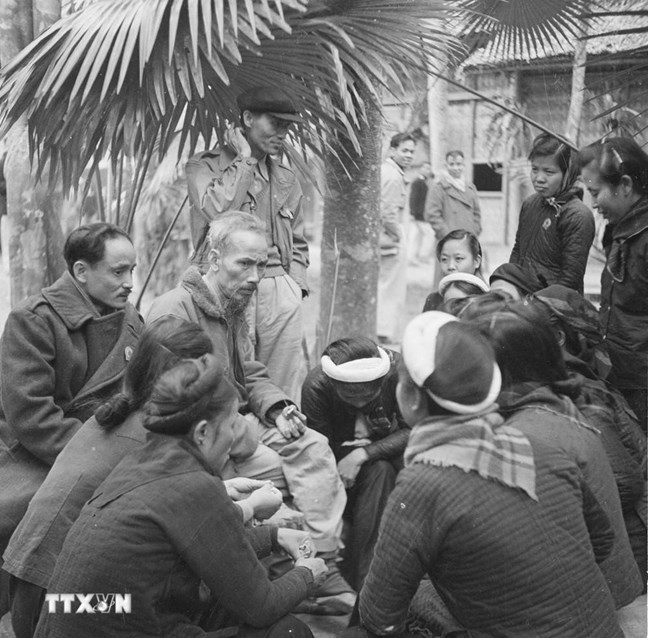 | Đồng chí Hoàng Quốc Việt và Chủ tịch Hồ Chí Minh với các đại biểu dự Đại hội toàn quốc thống nhất Việt Minh - Liên Việt (3/3/1951). (Ảnh: TTXVN) |