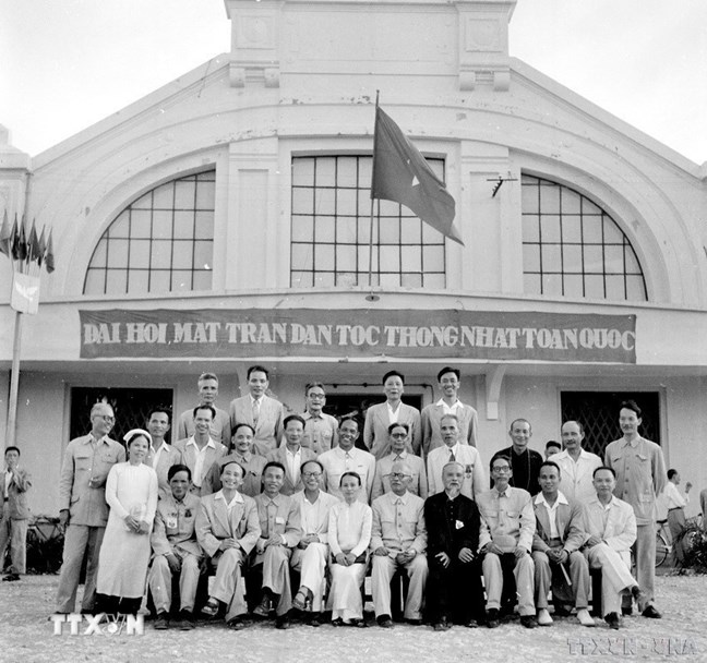 | Đồng chí Hoàng Quốc Việt (thứ 5, trái sang, hàng đứng) cùng các đồng chí trong Ban thường trực Mặt trận Dân tộc thống nhất toàn quốc, họp tại thủ đô Hà Nội, từ 5-10/9/1955. (Ảnh: Đức Hóa/TTXVN) |