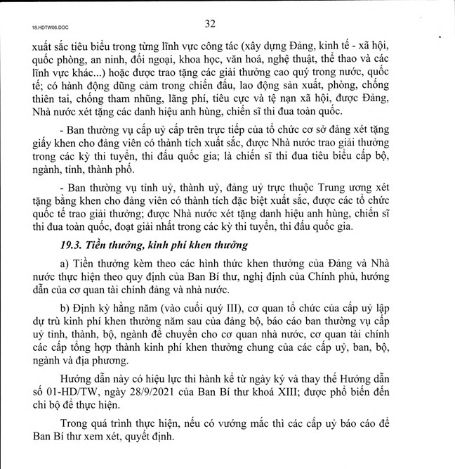 Hướng dẫn số 06 - HD/TW có hiệu lực thi hành kể từ ngày ký và thay thế Hướng dẫn số 01- HD/TW, ngày 28/9/2021của Ban Bí thư khóa XIII.