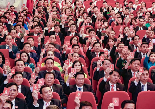 | Các đại biểu biểu quyết tại Đại hội đ ại biểu lần thứ XVII Đảng bộ thành phố Hà Nội_Ảnh: TTXVN |