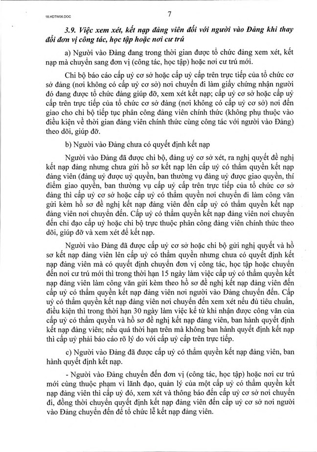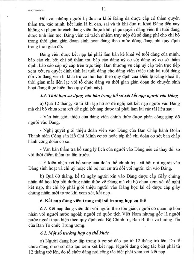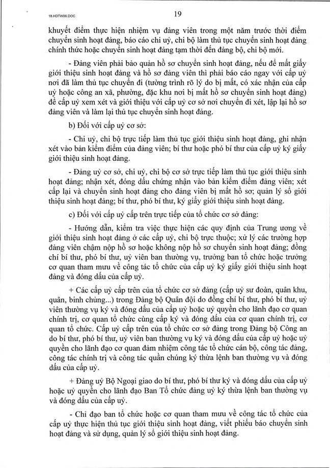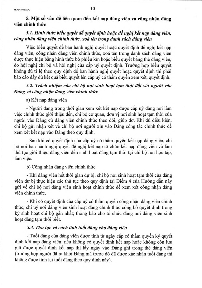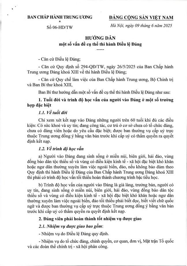 Căn cứ Điều lệ Đảng; Quy định số 294-QĐ/TW, ngày 26/5/2025 của Ban Chấp hành Trung ương Đảng khóa XIII về thi hành Điều lệ Đảng; Quy chế làm việc của Ban Chấp hành Trung ương, Bộ Chính trị và Ban Bí thư khóa XIII, Ban Bí thư hướng dẫn chi tiết đối với 19 vấn đề cụ thể: về tuổi đời và trình độ học vấn của người vào Đảng ở một số trường hợp đặc biệt; về đảng viên phải hoàn thành tốt nhiệm vụ được giao; thủ tục xem xét kết nạp đảng viên (kể cả kết nạp lại); kết nạp đảng viên trong một số trường hợp cụ thể; quản lý hồ sơ đảng viên; chuyển sinh hoạt đảng…