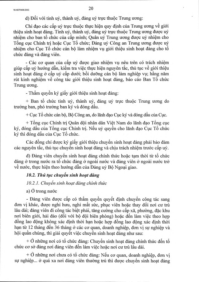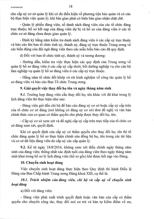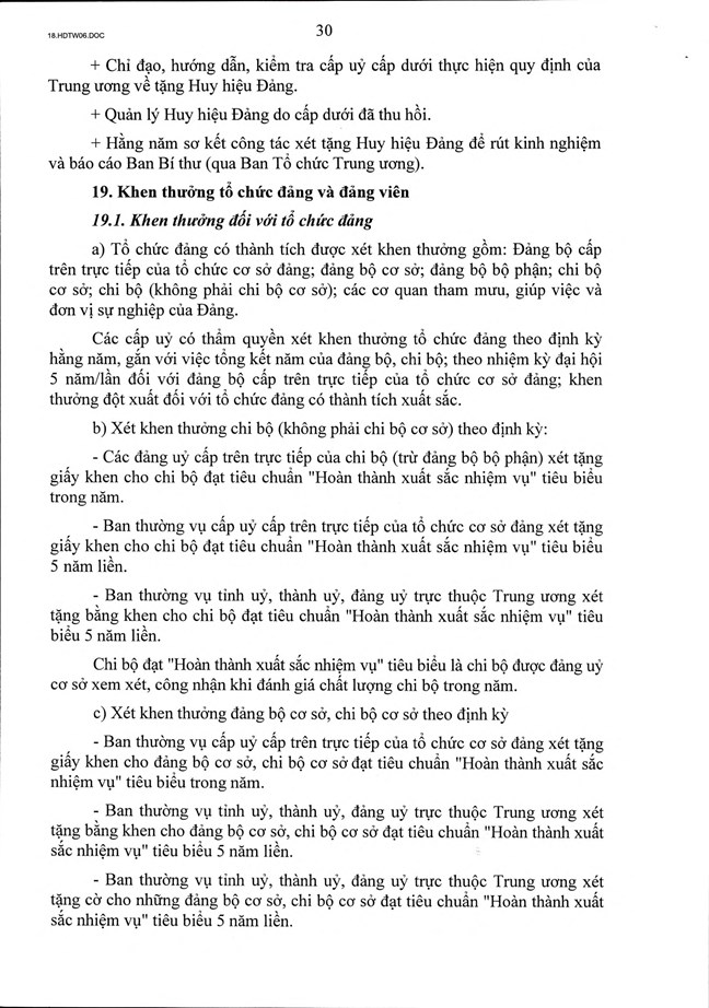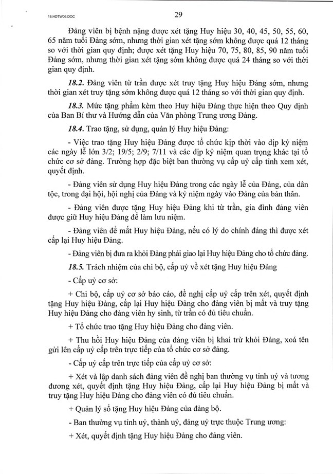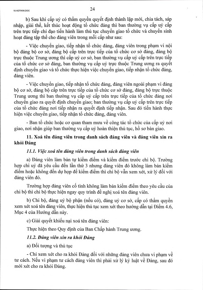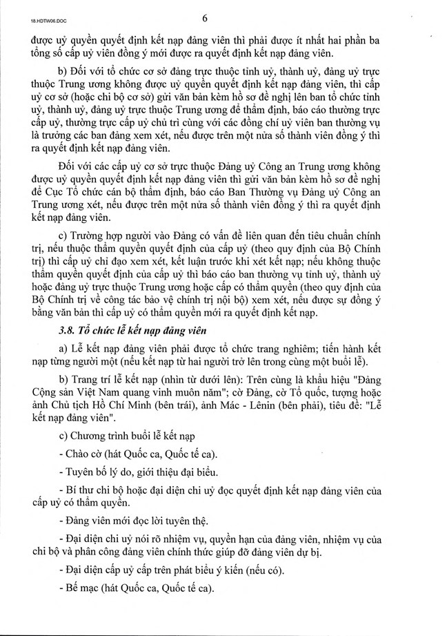 Hướng dẫn số 06- HD/TW được ban hành nhằm thực hiện Quy định 294-QĐ/TW, do Tổng Bí thư Tô Lâm ký ban hành ngày 26/5/2025 (thay thế Quy định số 232- QĐ/TW ngày 20/1/2025) về thi hành Điều lệ Đảng. Quy định số 294-QĐ/TW có hiệu lực thi hành từ ngày 1/7/2025, có một số điểm mới, trong đó, hệ thống tổ chức của Đảng được tổ chức theo mô hình chính quyền địa phương 2 cấp, bao gồm cấp xã (xã, phường, đặc khu) và cấp tỉnh (tỉnh, thành phố trực thuộc Trung ương), không còn cấp huyện. Quy định 294-QĐ/TW đề cập việc thí điểm tổ chức các đảng bộ xã, phường trực thuộc tỉnh ủy, thành ủy là đảng bộ cấp trên trực tiếp của tổ chức cơ sở đảng. Cấp ủy tỉnh, thành phố quyết định tổ chức đảng ở đặc khu là cấp trên trực tiếp của tổ chức cơ sở đảng hoặc là tổ chức cơ sở đảng sau khi có ý kiến thống nhất bằng văn bản của Ban Tổ chức Trung ương. Về nhiệm kỳ chi bộ, Quy định số 294-QĐ/TW nêu thí điểm đại hội chi bộ 5 năm một lần, so hiện nay, đối với chi bộ trực thuộc đảng ủy cơ sở đang thực hiện đại hội 5 năm 2 lần…