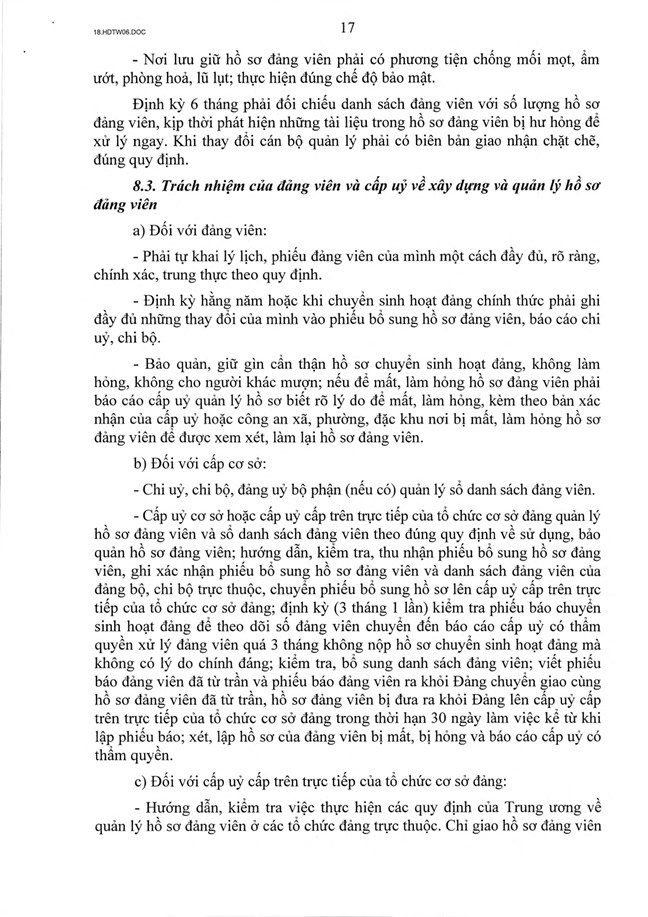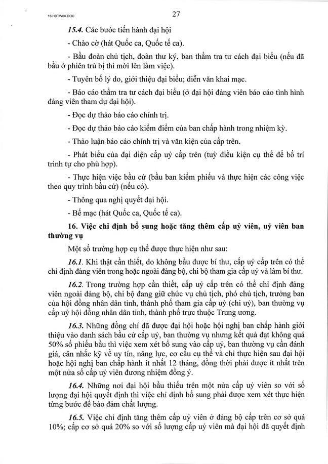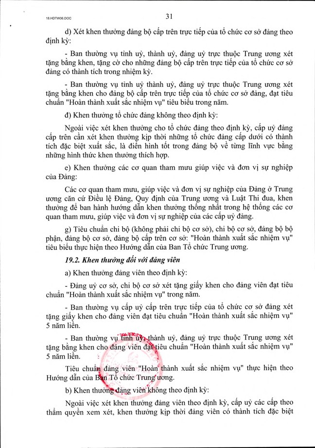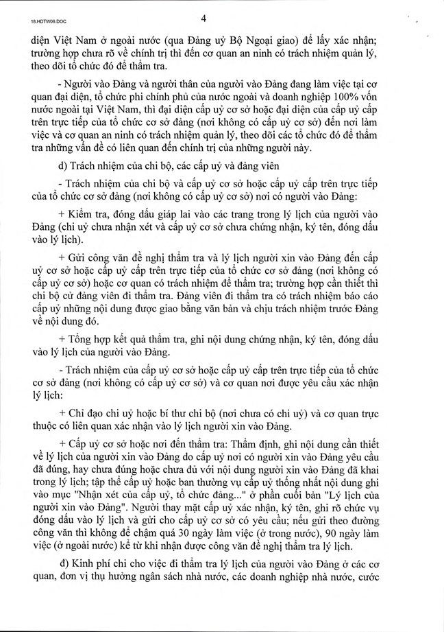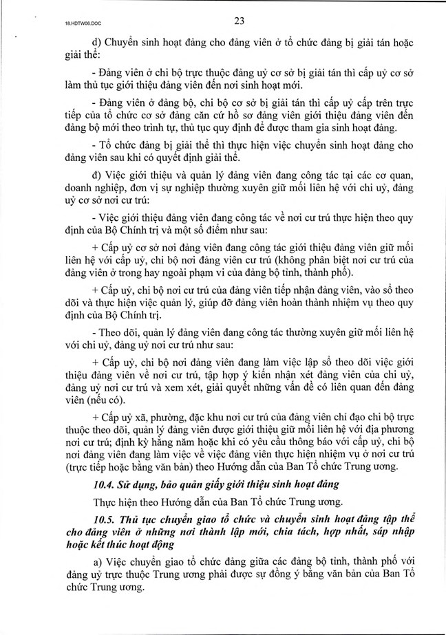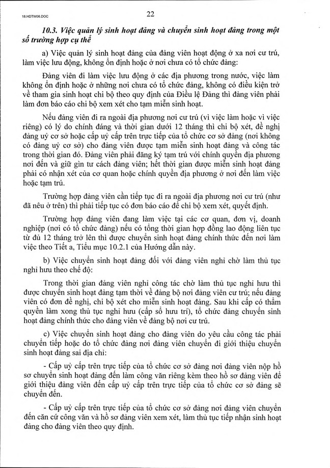 Hướng dẫn số 06- HD/TW được ban hành nhằm thực hiện Quy định 294-QĐ/TW, do Tổng Bí thư Tô Lâm ký ban hành ngày 26/5/2025 (thay thế Quy định số 232- QĐ/TW ngày 20/1/2025) về thi hành Điều lệ Đảng. Quy định số 294-QĐ/TW có hiệu lực thi hành từ ngày 1/7/2025, có một số điểm mới, trong đó, hệ thống tổ chức của Đảng được tổ chức theo mô hình chính quyền địa phương 2 cấp, bao gồm cấp xã (xã, phường, đặc khu) và cấp tỉnh (tỉnh, thành phố trực thuộc Trung ương), không còn cấp huyện. Quy định 294-QĐ/TW đề cập việc thí điểm tổ chức các đảng bộ xã, phường trực thuộc tỉnh ủy, thành ủy là đảng bộ cấp trên trực tiếp của tổ chức cơ sở đảng. Cấp ủy tỉnh, thành phố quyết định tổ chức đảng ở đặc khu là cấp trên trực tiếp của tổ chức cơ sở đảng hoặc là tổ chức cơ sở đảng sau khi có ý kiến thống nhất bằng văn bản của Ban Tổ chức Trung ương. Về nhiệm kỳ chi bộ, Quy định số 294-QĐ/TW nêu thí điểm đại hội chi bộ 5 năm một lần, so hiện nay, đối với chi bộ trực thuộc đảng ủy cơ sở đang thực hiện đại hội 5 năm 2 lần…