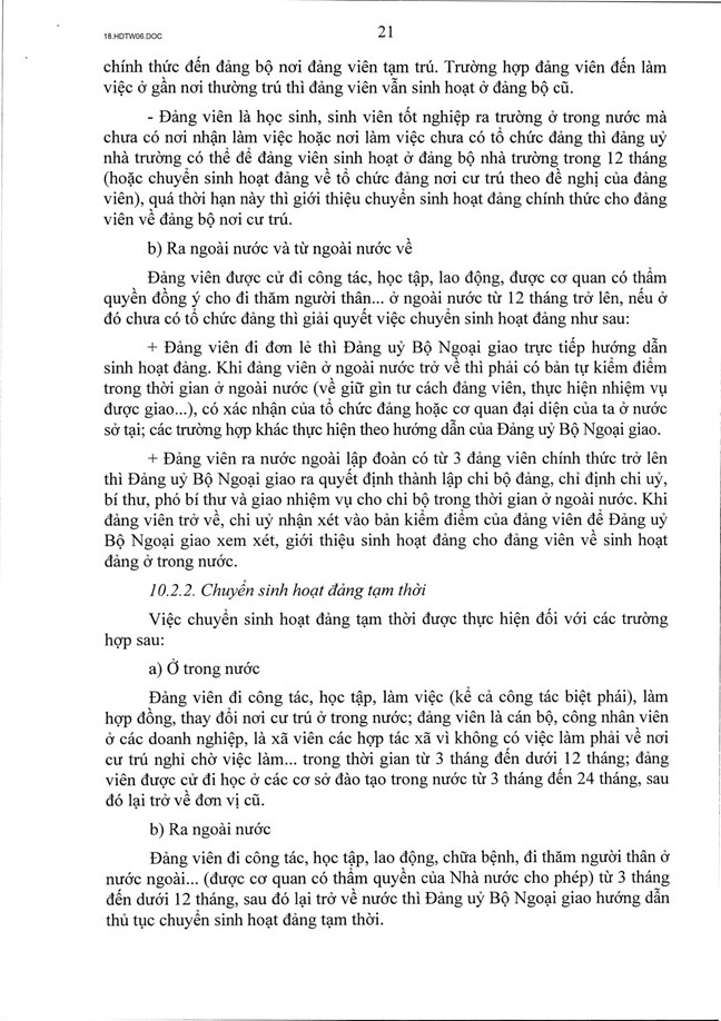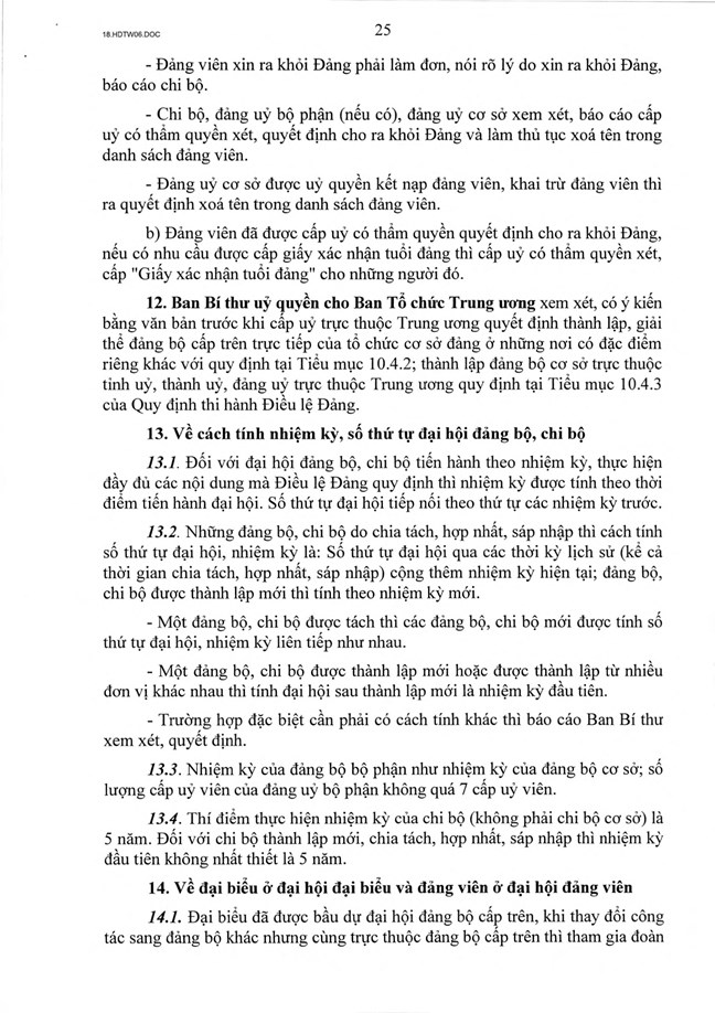 Những đảng bộ, chi bộ do chia tách, hợp nhất, sáp nhập thì cách tính số thứ tự đại hội, nhiệm kỳ là số thứ tự đại hội qua các thời kỳ lịch sử (kể cả thời gian chia tách, hợp nhất, sáp nhập) cộng thêm nhiệm kỳ hiện tại; đảng bộ, chi bộ được thành lập mới thì tính theo nhiệm kỳ mới. Một đảng bộ, chi bộ được tách thì các đảng bộ, chi bộ mới được tính số thứ tự đại hội, nhiệm kỳ liên tiếp như nhau. Một đảng bộ, chi bộ được thành lập mới hoặc được thành lập từ nhiều đơn vị khác nhau thì tính đại hội sau thành lập mới là nhiệm kỳ đầu tiên. Trường hợp đặc biệt cần phải có cách tính khác thì báo cáo Ban Bí thư xem xét, quyết định.