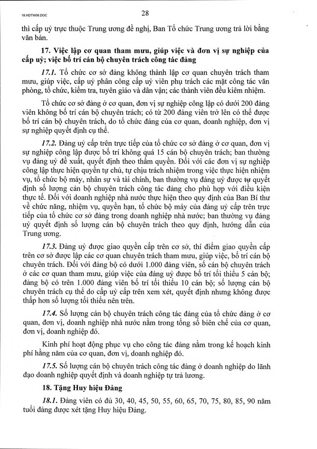 Nhiệm kỳ của đảng bộ bộ phận như nhiệm kỳ của đảng bộ cơ sở; số lượng cấp ủy viên của đảng ủy bộ phận không quá 7 cấp ủy viên. Thí điểm thực hiện nhiệm kỳ của chi bộ (không phải chi bộ cơ sở) là 5 năm. Đối với chi bộ thành lập mới, chia tách, hợp nhất, sáp nhập thì nhiệm kỳ đầu tiên không nhất thiết là 5 năm…