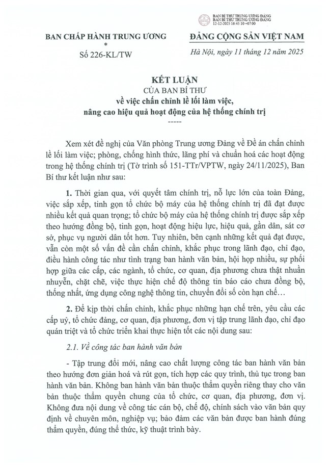 Xem xét đề nghị của Văn phòng Trung ương Đảng về Đề án chấn chỉnh lề lối làm việc; phòng, chống hình thức, lãng phí và chuẩn hóa các hoạt động trong hệ thống chính trị (Tờ trình số 151-TTr/VPTW, ngày 24/11/2025), Ban Bí thư kết luận như sau: