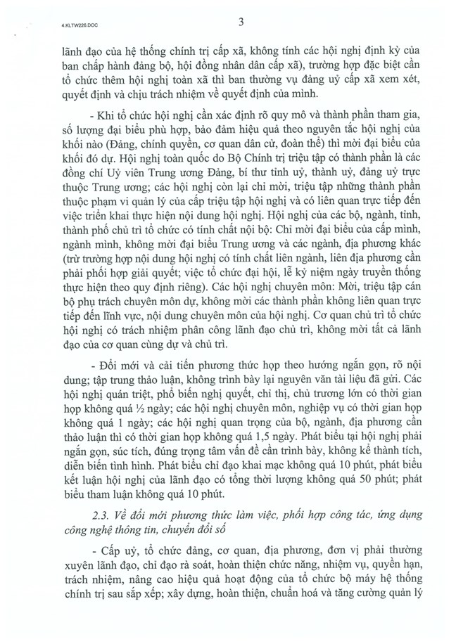 - Các cấp uỷ, tổ chức đảng, chính quyền, đoàn thể tăng cường điều phối việc tổ chức hội nghị của cấp mình, ngành mình, đơn vị mình, tránh trùng lặp, quá tải, tập trung vào thời điểm đầu năm hoặc cuối năm; một năm cấp tỉnh tổ chức không quá 2 hội nghị có quy mô toàn tỉnh (thành phần là tất cả lãnh đạo của hệ thống chính trị tỉnh, thành phố, không tính các hội nghị định kỳ của ban chấp hành đảng bộ, hội đồng nhân dân tỉnh, thành phố), trường hợp đặc biệt cần tổ chức thêm hội nghị toàn tỉnh thì ban thường vụ tỉnh uỷ, thành uỷ xem xét, quyết định và chịu trách nhiệm về quyết định của mình; cấp xã tổ chức không quá 3 hội nghị có quy mô toàn xã (thành phần là tất cả lãnh đạo của hệ thống chính trị cấp xã, không tính các hội nghị định kỳ của ban chấp hành đảng bộ, hội đồng nhân dân cấp xã), trường hợp đặc biệt cần tổ chức thêm hội nghị toàn xã thì ban thường vụ đảng ủy cấp xã xem xét, quyết định và chịu trách nhiệm về quyết định của mình.
