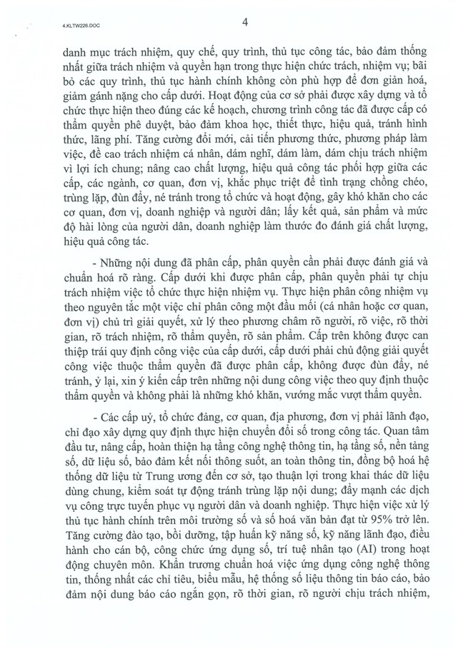 - Tập trung đổi mới, nâng cao chất lượng công tác ban hành văn bản theo hướng đơn giản hóa và rút gọn, tích hợp các quy trình, thủ tục trong ban hành văn bản. Không ban hành văn bản thuộc thẩm quyền riêng thay cho văn bản thuộc thẩm quyền chung của tổ chức, cơ quan, địa phương, đơn vị. Không đưa nội dung về công tác cán bộ, chế độ, chính sách vào văn bản quy định về chuyên môn, nghiệp vụ; bảo đảm các văn bản được ban hành đúng thẩm quyền, đúng thể thức, kỹ thuật trình bày.