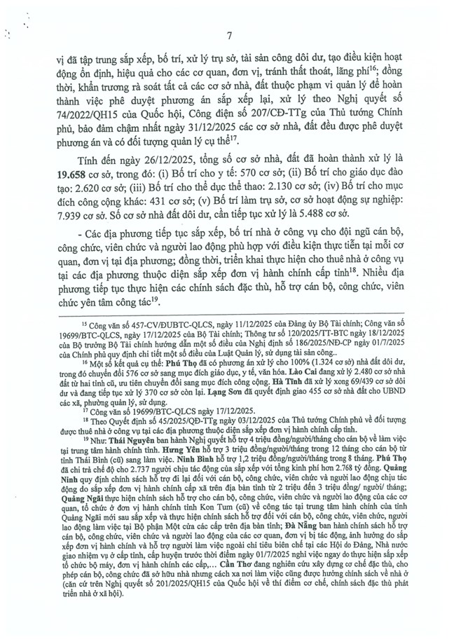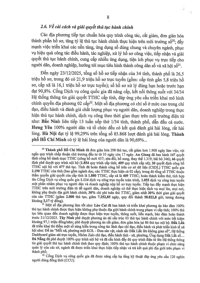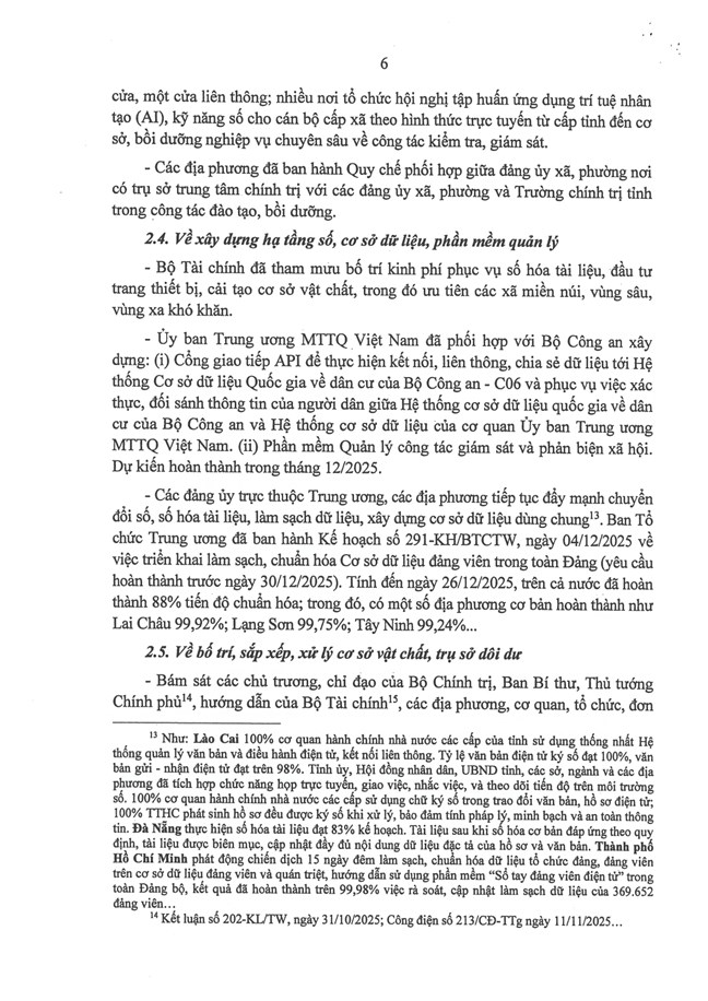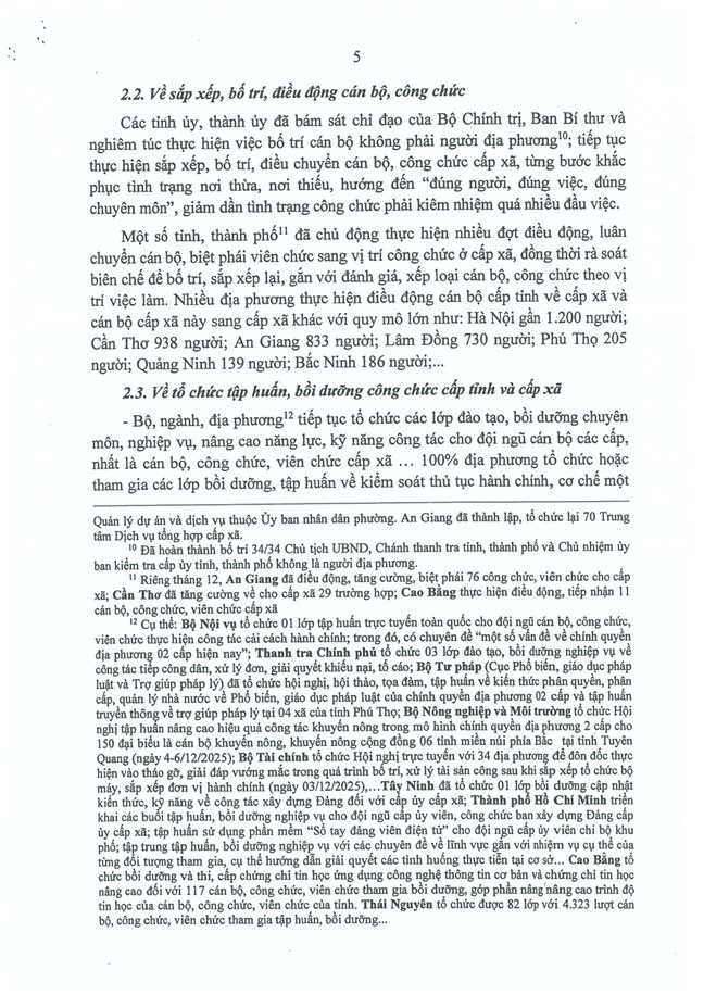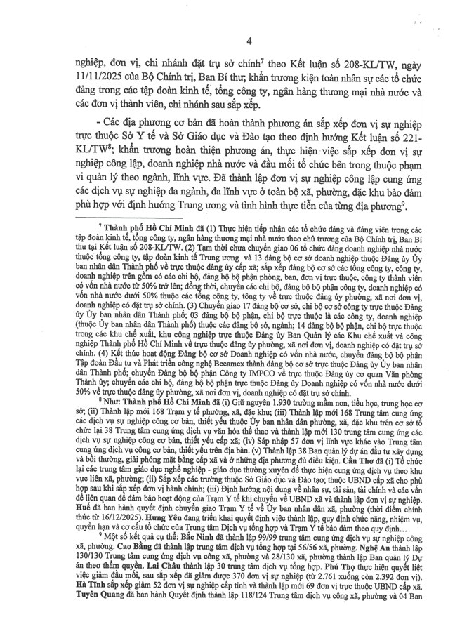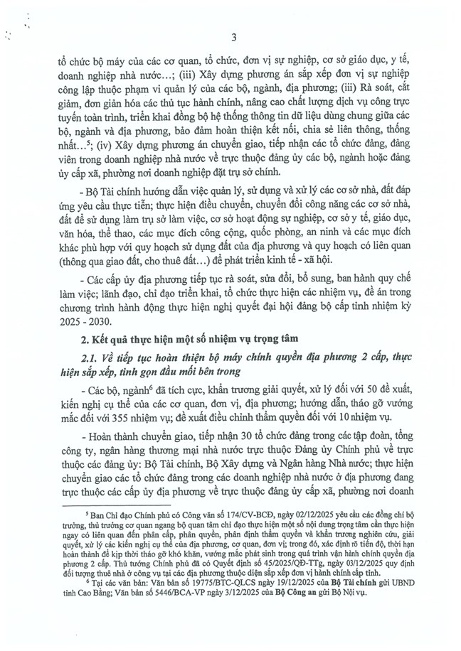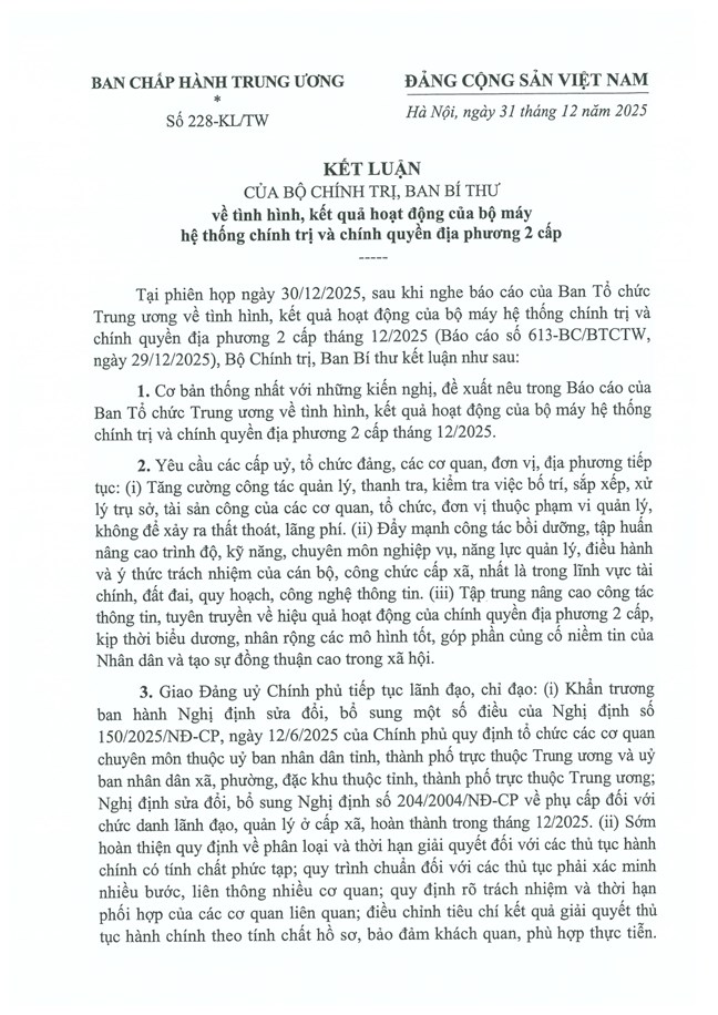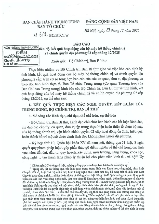 Tại phiên họp ngày 30/12/2025, sau khi nghe báo cáo của Ban Tổ chức Trung ương về tình hình, kết quả hoạt động của bộ máy hệ thống chính trị và chính quyền địa phương 2 cấp tháng 12/2025 (Báo cáo số 613-BC/BTCTW, ngày 29/12/2025), Bộ Chính trị, Ban Bí thư kết luận như sau: