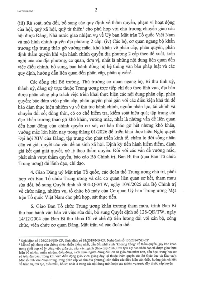 4. Giao Đảng uỷ Mặt trận Tổ quốc, các đoàn thể Trung ương chủ trì, phối hợp với Ban Tổ chức Trung ương và các cơ quan liên quan sơ kết, tham mưu sửa đổi, bổ sung Quyết định số 304-QĐ/TW, ngày 10/6/2025 của Bộ Chính trị về chức năng, nhiệm vụ, tổ chức bộ máy của Cơ quan Uỷ ban Trung ương Mặt trận Tổ quốc Việt Nam cho phù hợp, sát thực tiễn.