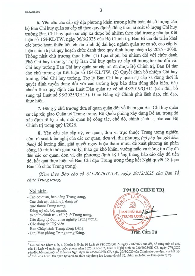 7. Đồng ý chủ trương đưa sĩ quan quân đội về tham gia Ban Chỉ huy quân sự cấp xã; giao Quân uỷ Trung ương, Bộ Quốc phòng xây dựng Đề án, trong đó xác định rõ lộ trình, mối quan hệ công tác, chế độ, chính sách…; báo cáo Bộ Chính trị trong quý I/2026.