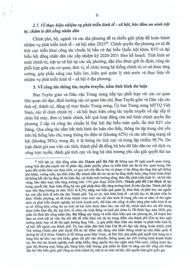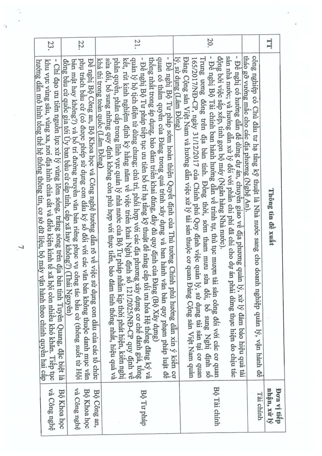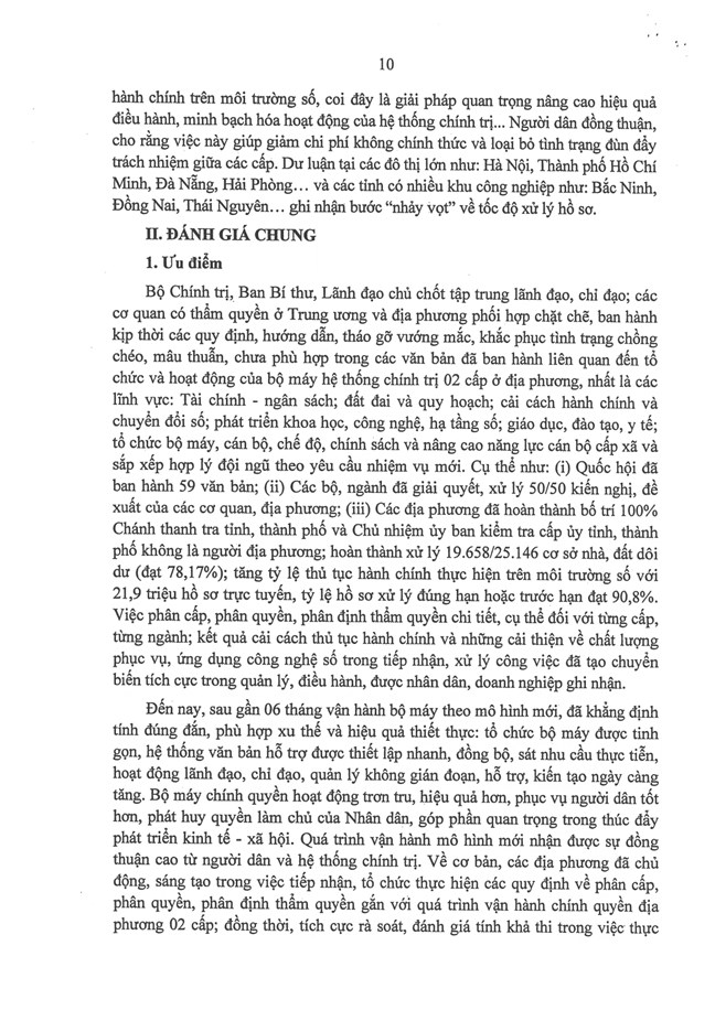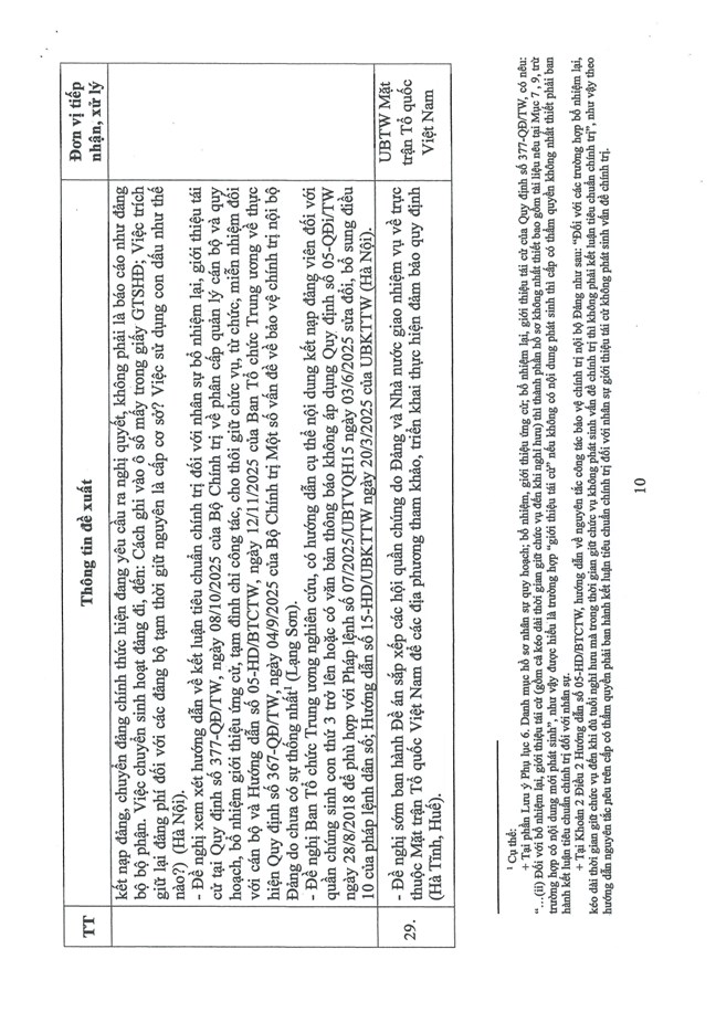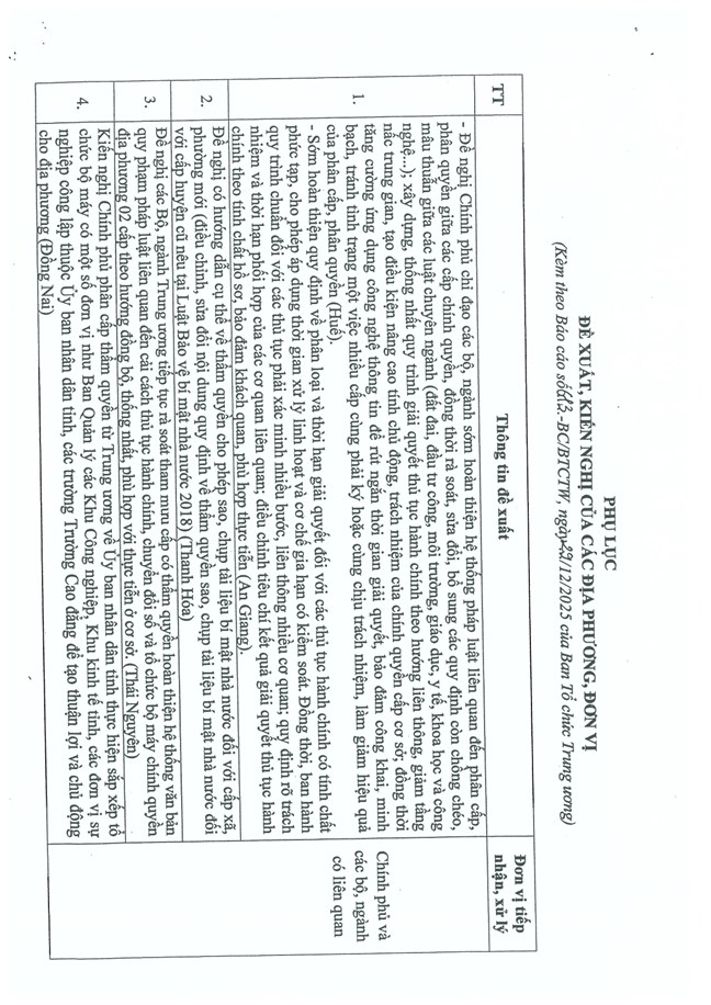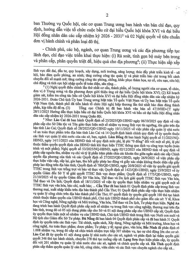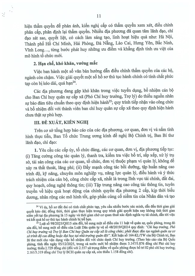 1. Cơ bản thống nhất với những kiến nghị, đề xuất nêu trong Báo cáo của Ban Tổ chức Trung ương về tình hình, kết quả hoạt động của bộ máy hệ thống chính trị và chính quyền địa phương 2 cấp tháng 12/2025.