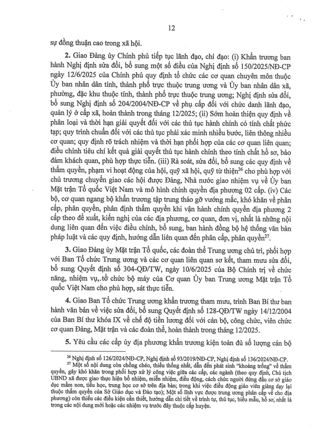 3. Giao Đảng uỷ Chính phủ tiếp tục lãnh đạo, chỉ đạo: (i) Khẩn trương ban hành Nghị định sửa đổi, bổ sung một số điều của Nghị định số 150/2025/NĐ-CP, ngày 12/6/2025 của Chính phủ quy định tổ chức các cơ quan chuyên môn thuộc uỷ ban nhân dân tỉnh, thành phố trực thuộc Trung ương và uỷ ban nhân dân xã, phường, đặc khu thuộc tỉnh, thành phố trực thuộc Trung ương; Nghị định sửa đổi, bổ sung Nghị định số 204/2004/NĐ-CP về phụ cấp đối với chức danh lãnh đạo, quản lý ở cấp xã, hoàn thành trong tháng 12/2025. (ii) Sớm hoàn thiện quy định về phân loại và thời hạn giải quyết đối với các thủ tục hành chính có tính chất phức tạp; quy trình chuẩn đối với các thủ tục phải xác minh nhiều bước, liên thông nhiều cơ quan; quy định rõ trách nhiệm và thời hạn phối hợp của các cơ quan liên quan; điều chỉnh tiêu chí kết quả giải quyết thủ tục hành chính theo tính chất hồ sơ, bảo đảm khách quan, phù hợp thực tiễn. (iii) Rà soát, sửa đổi, bổ sung các quy định về thẩm quyền, phạm vi hoạt động của hội, quỹ xã hội, quỹ từ thiện1 cho phù hợp với chủ trương chuyển giao các hội được Đảng, Nhà nước giao nhiệm vụ về Uỷ ban Mặt trận Tổ quốc Việt Nam và mô hình chính quyền địa phương 2 cấp. (iv) Các bộ, cơ quan ngang bộ khẩn trương tập trung tháo gỡ vướng mắc, khó khăn về phân cấp, phân quyền, phân định thẩm quyền khi vận hành chính quyền địa phương 2 cấp theo đề xuất, kiến nghị của các địa phương, cơ quan, đơn vị, nhất là những nội dung liên quan đến việc điều chỉnh, bổ sung, ban hành đồng bộ hệ thống văn bản pháp luật và các quy định, hướng dẫn liên quan đến phân cấp, phân quyền2.