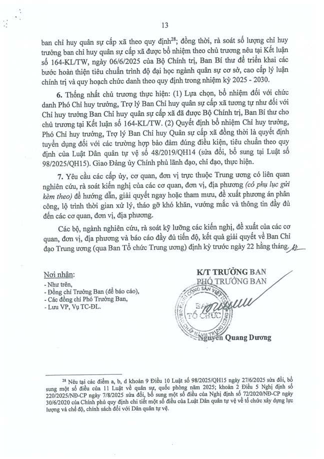 6. Yêu cầu các cấp uỷ địa phương khẩn trương kiện toàn đủ số lượng cán bộ Ban Chỉ huy quân sự cấp xã theo quy định3; đồng thời, rà soát số lượng Chỉ huy trưởng Ban Chỉ huy quân sự cấp xã được bổ nhiệm theo chủ trương nêu tại Kết luận số 164-KL/TW, ngày 06/6/2025 của Bộ Chính trị, Ban Bí thư để triển khai các bước hoàn thiện tiêu chuẩn trình độ đại học ngành quân sự cơ sở, cao cấp lý luận chính trị và quy hoạch chức danh theo quy định trong nhiệm kỳ 2025 - 2030. Thống nhất chủ trương thực hiện: (1) Lựa chọn, bổ nhiệm đối với chức danh Phó Chỉ huy trưởng, Trợ lý Ban Chỉ huy quân sự cấp xã tương tự như đối với Chỉ huy trưởng Ban Chỉ huy quân sự cấp xã đã được Bộ Chính trị, Ban Bí thư cho chủ trương tại Kết luận số 164-KL/TW. (2) Quyết định bổ nhiệm Chỉ huy trưởng, Phó Chỉ huy trưởng, Trợ lý Ban Chỉ huy quân sự cấp xã đồng thời là quyết định tuyển dụng đối với các trường hợp bảo đảm đúng điều kiện, tiêu chuẩn theo quy định của Luật Dân quân tự vệ số 48/2019/QH14 (sửa đổi, bổ sung tại Luật số 98/2025/QH15). Giao Đảng uỷ Chính phủ lãnh đạo, chỉ đạo, thực hiện.