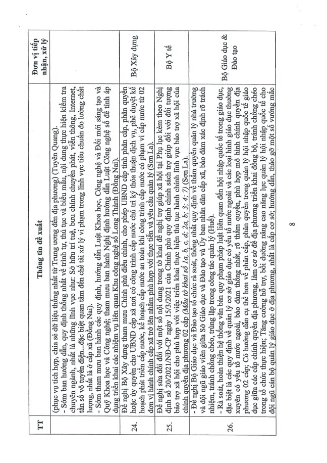 8. Yêu cầu các cấp uỷ, cơ quan, đơn vị trực thuộc Trung ương nghiên cứu, rà soát kiến nghị của các cơ quan, đơn vị, địa phương (có phụ lục gửi kèm theo) để hướng dẫn, giải quyết ngay hoặc tham mưu, đề xuất phương án phân công, lộ trình thời gian xử lý, tháo gỡ khó khăn, vướng mắc và thông tin đầy đủ đến các cơ quan, đơn vị, địa phương; định kỳ hằng tháng báo cáo đầy đủ tiến độ, kết quả thực hiện về Ban Chỉ đạo Trung ương tổng kết Nghị quyết 18 (qua Ban Tổ chức Trung ương.
