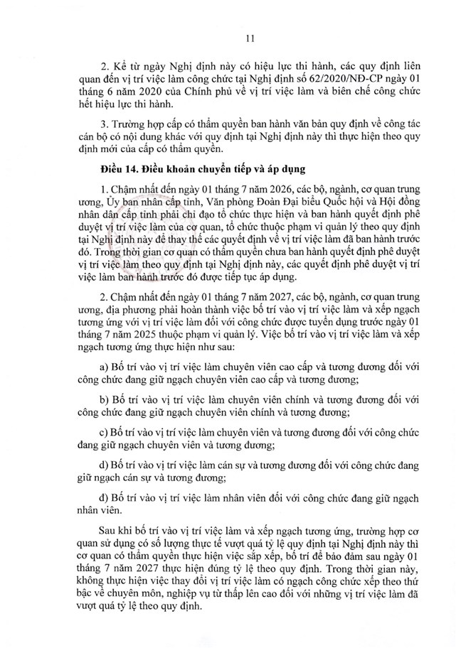 Chậm nhất đến ngày 01/7/2026, các bộ, ngành, cơ quan trung ương, Ủy ban nhân cấp tỉnh, Văn phòng Đoàn Đại biểu Quốc hội và Hội đồng nhân dân cấp tỉnh phải chỉ đạo tổ chức thực hiện và ban hành quyết định phê duyệt vị trí việc làm của cơ quan, tổ chức thuộc phạm vi quản lý theo quy định tại Nghị định này để thay thế các quyết định về vị trí việc làm đã ban hành trước đó.