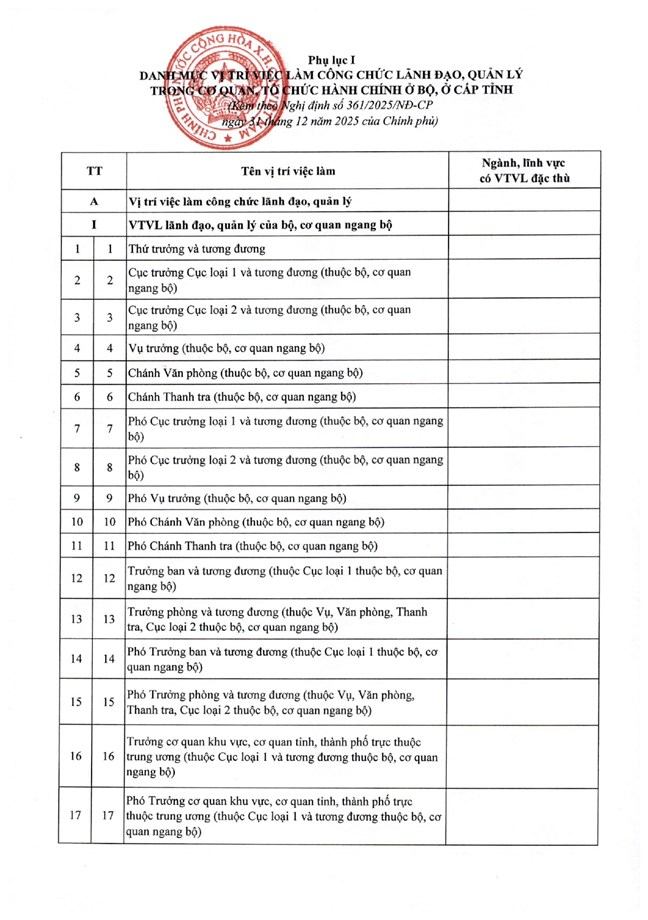 a) Phụ lục I về danh mục vị trí việc làm công chức lãnh đạo, quản lý trong cơ quan, tổ chức hành chính ở bộ, ở cấp tỉnh;