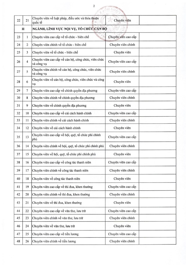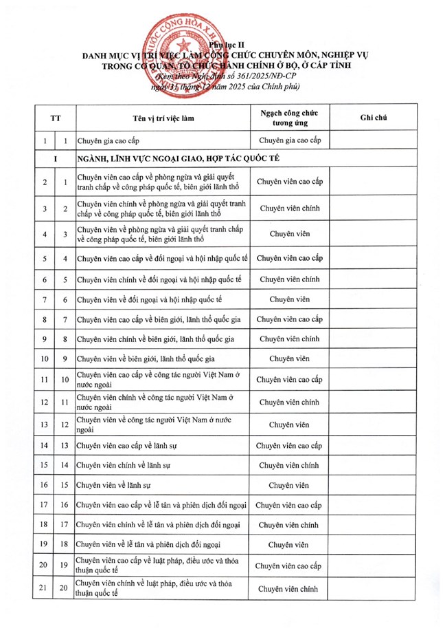 b) Phụ lục II về danh mục vị trí việc làm công chức chuyên môn, nghiệp vụ trong cơ quan, tổ chức hành chính ở bộ, ở cấp tỉnh;