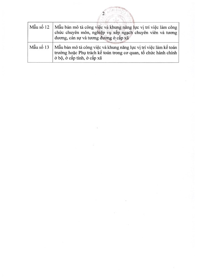 m) Mẫu số 12 thực hiện đối với vị trí việc làm công chức chuyên môn, nghiệp vụ xếp ngạch chuyên viên và tương đương, ngạch cán sự và tương đương ở cấp xã. Cơ quan có thẩm quyền phê duyệt vị trí việc làm quyết định việc áp dụng mẫu này khi xây dựng bản mô tả công việc và khung năng lực vị trí việc làm đối với công chức Ban Chỉ huy quân sự cấp xã, bảo đảm phù hợp với quy định của pháp luật về dân quân tự vệ;
