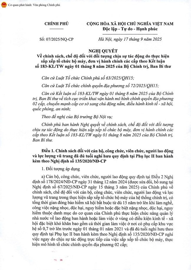 TOÀN VĂN: Nghị quyết 07/2025/NQ-CP về chính sách, chế độ với đối tượng chịu sự tác động do thực hiện sắp xếp tổ chức bộ máy, đơn vị hành chính các cấp theo Kết luận 183-KL/TW