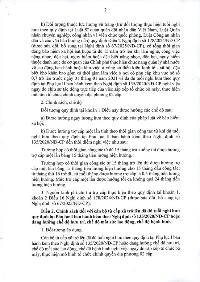 b- Đối tượng thuộc lực lượng vũ trang (trừ đối tượng thực hiện tuổi nghỉ hưu theo quy định tại Luật Sĩ quan quân đội nhân dân Việt Nam, Luật Quân nhân chuyên nghiệp, công nhân và viên chức quốc phòng, Luật Công an nhân dân và các văn bản hướng dẫn) quy định Điều 2 Nghị định số 178/2024/NĐ-CP (được sửa đổi, bổ sung tại Nghị định số 67/2025/NĐ-CP), có tổng thời gian đóng bảo hiểm xã hội bắt buộc từ đủ 15 năm trở lên khi làm nghề, công việc nặng nhọc, độc hại, nguy hiểm hoặc đặc biệt nặng nhọc, độc hại, nguy hiểm thuộc danh mục do cơ quan của Chính phủ thực hiện chức năng quản lý nhà nước về lao động ban hành hoặc làm việc ở vùng có điều kiện kinh tế - xã hội đặc biệt khó khăn bao gồm cả thời gian làm việc ở nơi có phụ cấp khu vực hệ số 0,7 trở lên trước ngày 1/1/2021 và đã đủ tuổi nghỉ hưu theo quy định tại Phụ lục II ban hành kèm theo Nghị định số 135/2020/NĐ-CP nghỉ việc ngay do chịu sự tác động trực tiếp của việc sắp xếp tổ chức bộ máy, thực hiện mô hình tổ chức chính quyền địa phương 02 cấp.