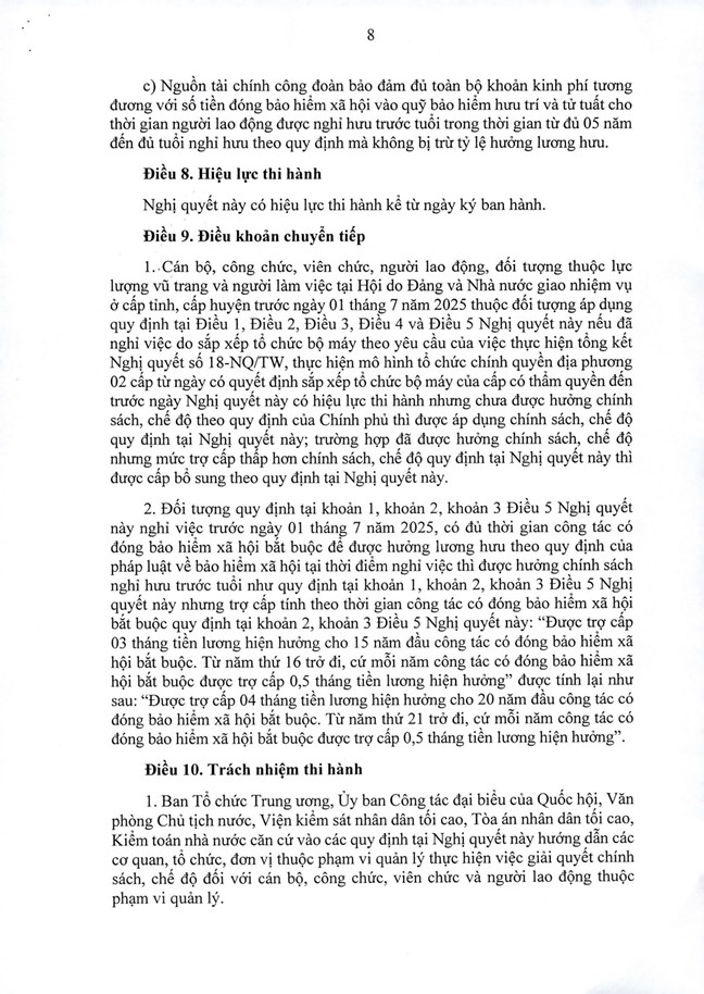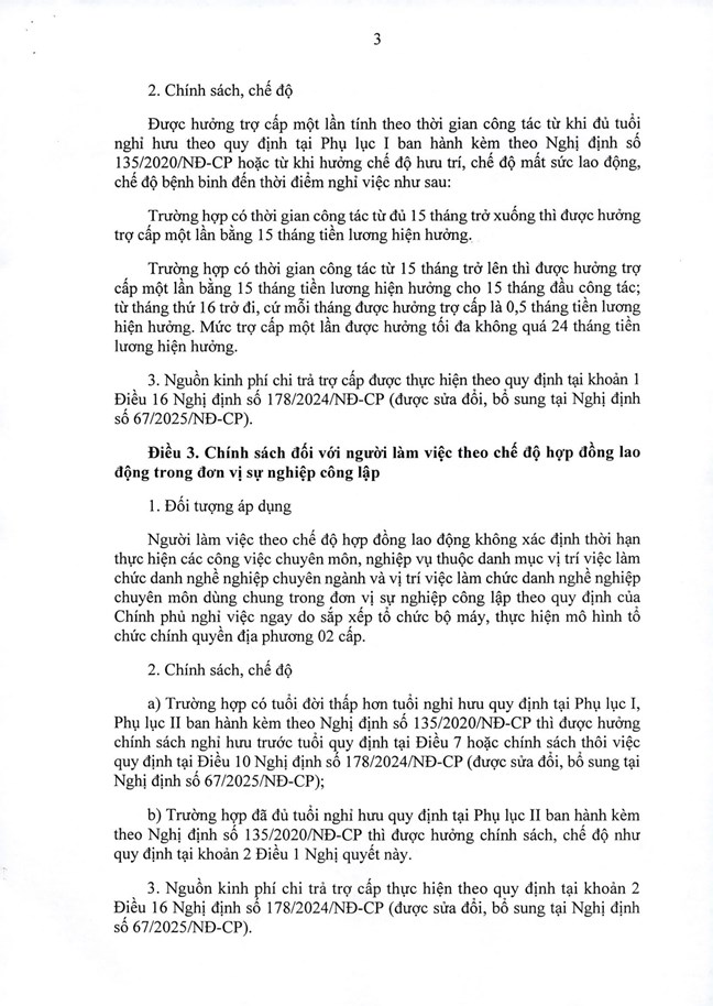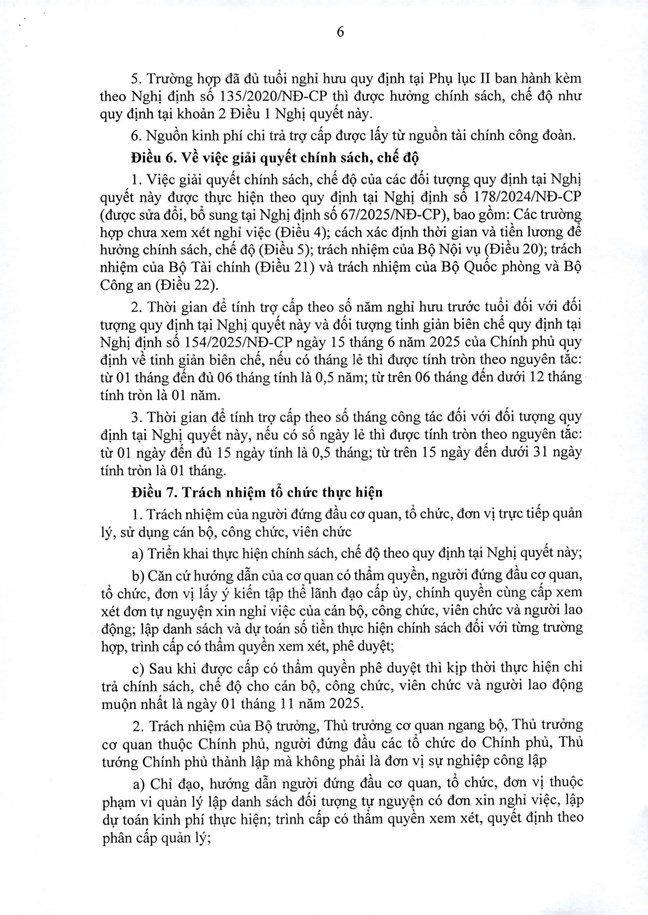 Nghị quyết nêu rõ, cán bộ, công chức, viên chức, người lao động, đối tượng thuộc lực lượng vũ trang và người làm việc tại Hội do Đảng và Nhà nước giao nhiệm vụ ở cấp tỉnh, cấp huyện trước ngày 1/7/2025 thuộc các đối tượng trên nếu đã nghỉ việc do sắp xếp tổ chức bộ máy theo yêu cầu của việc thực hiện tổng kết Nghị quyết số 18-NQ/TW, thực hiện mô hình tổ chức chính quyền địa phương 02 cấp từ ngày có quyết định sắp xếp tổ chức bộ máy của cấp có thẩm quyền đến trước ngày 17/9/2025 nhưng chưa được hưởng chính sách, chế độ theo quy định của Chính phủ thì được áp dụng chính sách, chế độ quy định tại Nghị quyết này; trường hợp đã được hưởng chính sách, chế độ nhưng mức trợ cấp thấp hơn chính sách, chế độ quy định tại Nghị quyết này thì được cấp bổ sung theo quy định tại Nghị quyết này.