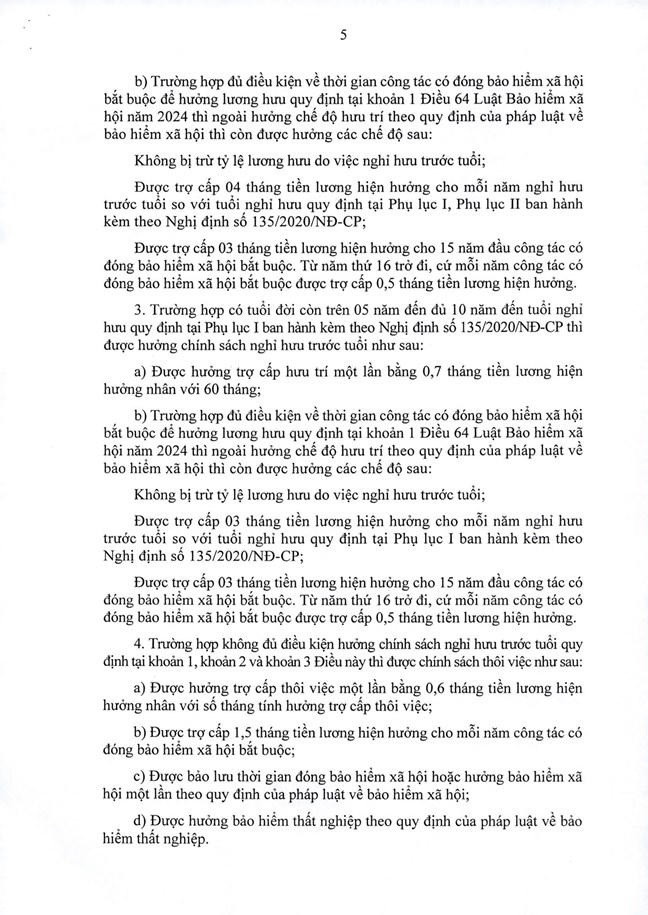 Nghị quyết nêu, trường hợp có tuổi đời thấp hơn tuổi nghỉ hưu quy định tại Phụ lục I, Phụ lục II ban hành kèm theo Nghị định số 135/2020/NĐ-CP thì được hưởng chính sách nghỉ hưu trước tuổi quy định tại Điều 7 hoặc chính sách thôi việc quy định tại Điều 10 Nghị định số 178/2024/NĐ-CP (được sửa đổi, bổ sung tại Nghị định số 67/2025/NĐ-CP);