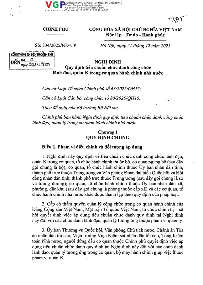 TOÀN VĂN: Nghị định số 334/2025/NĐ-CP quy định tiêu chuẩn chức danh công chức lãnh đạo, quản lý