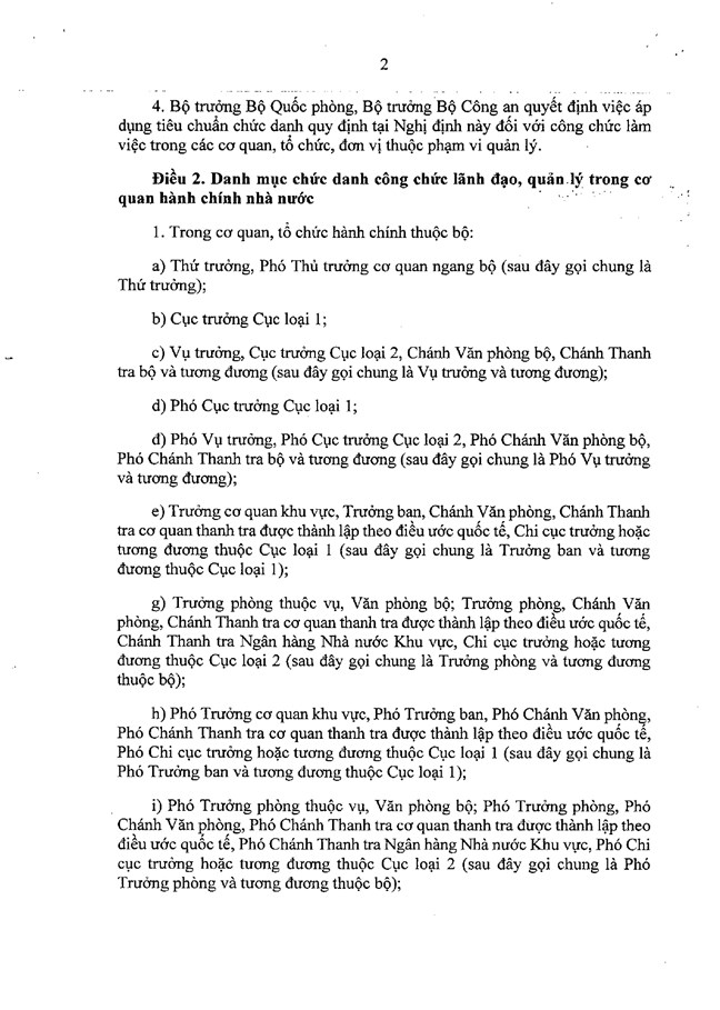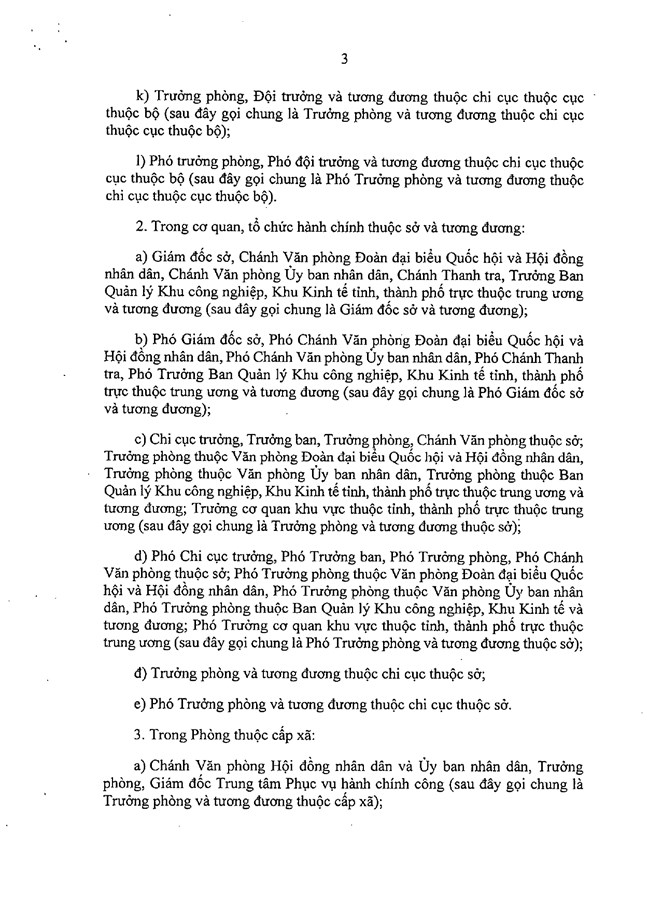 a- Thứ trưởng, Phó Thủ trưởng cơ quan ngang bộ (gọi chung là Thứ trưởng); b- Cục trưởng Cục loại 1; c- Vụ trưởng, Cục trưởng Cục loại 2, Chánh Văn phòng bộ, Chánh Thanh tra bộ và tương đương (gọi chung là Vụ trưởng và tương đương); d- Phó Cục trưởng Cục loại 1; đ- Phó Vụ trưởng, Phó Cục trưởng Cục loại 2, Phó Chánh Văn phòng bộ, Phó Chánh Thanh tra bộ và tương đương (gọi chung là Phó Vụ trưởng và tương đương);