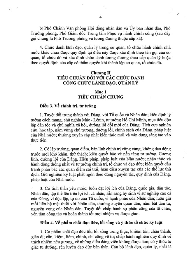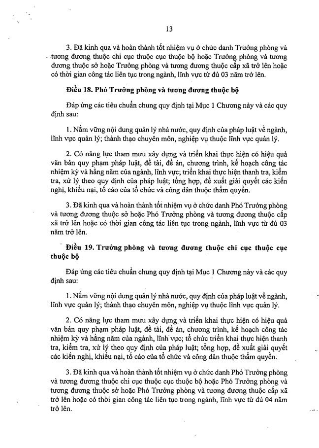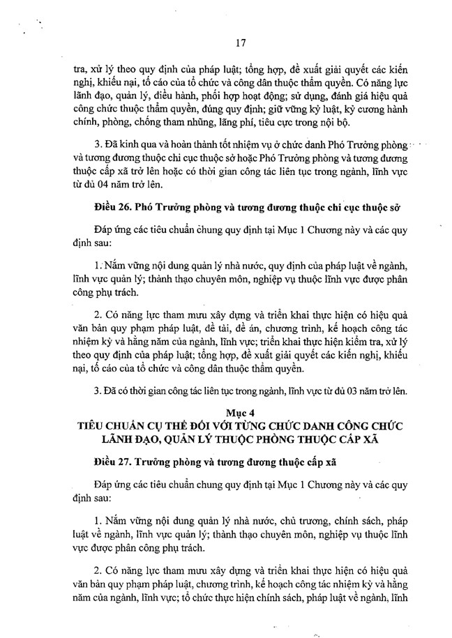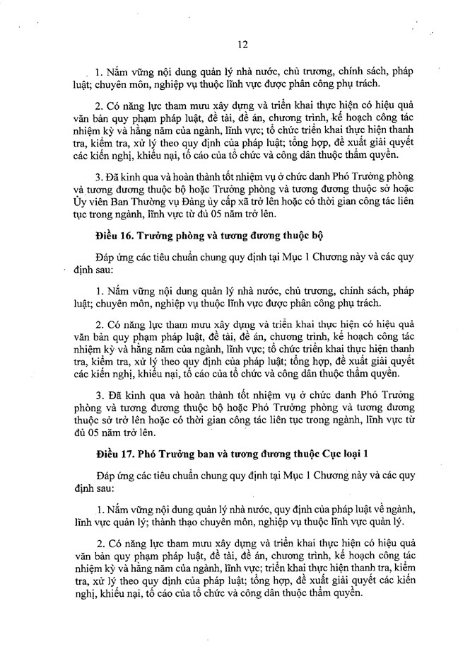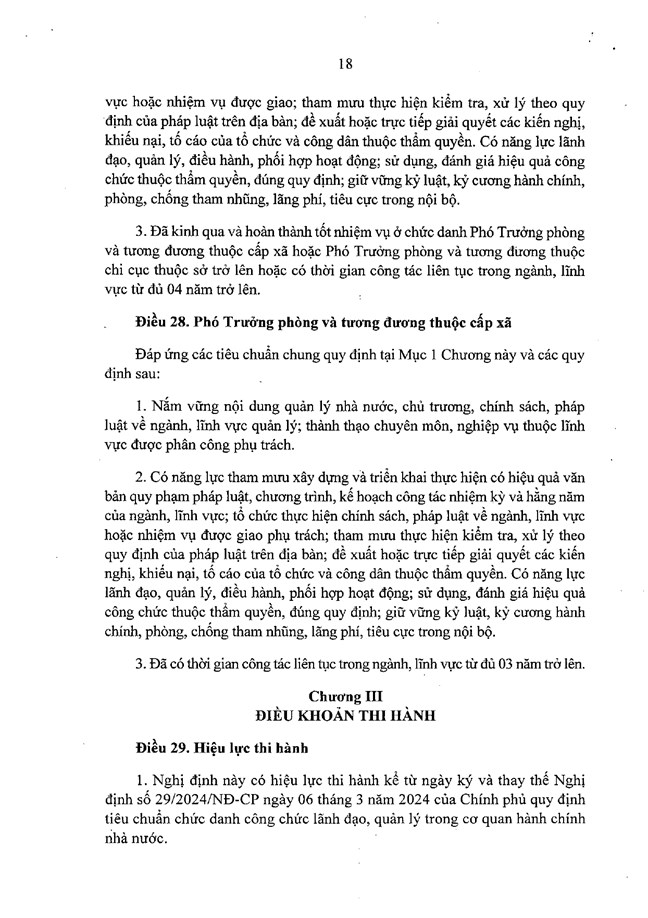 Ngoài ra, Nghị định cũng quy định cụ thể các tiêu chuẩn đối với từng chức danh công chức lãnh đạo, quản lý thuộc Bộ, thuộc sở và tương đương, phòng thuộc cấp xã.