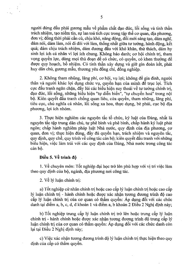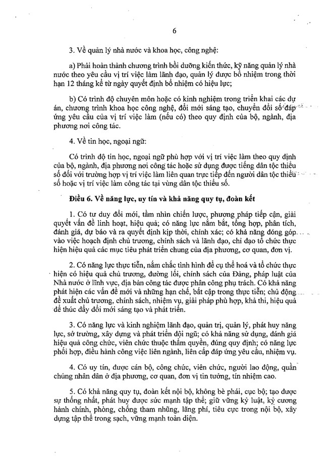 Về năng lực, uy tín và khả năng quy tụ, đoàn kết, Nghị định nêu rõ: Có tư duy đổi mới, tầm nhìn chiến lược, phương pháp tiếp cận, giải quyết vấn đề linh hoạt, hiệu quả; có năng lực nắm bắt, tổng hợp, phân tích, đánh giá, dự báo và ra quyết định kịp thời, chính xác; có khả năng đóng góp vào việc hoạch định chủ trương, chính sách và lãnh đạo, chỉ đạo tổ chức thực hiện hiệu quả các mục tiêu phát triển chung của địa phương, cơ quan, đơn vị.