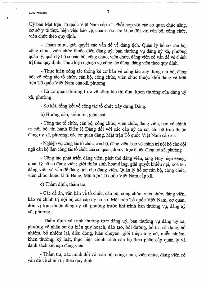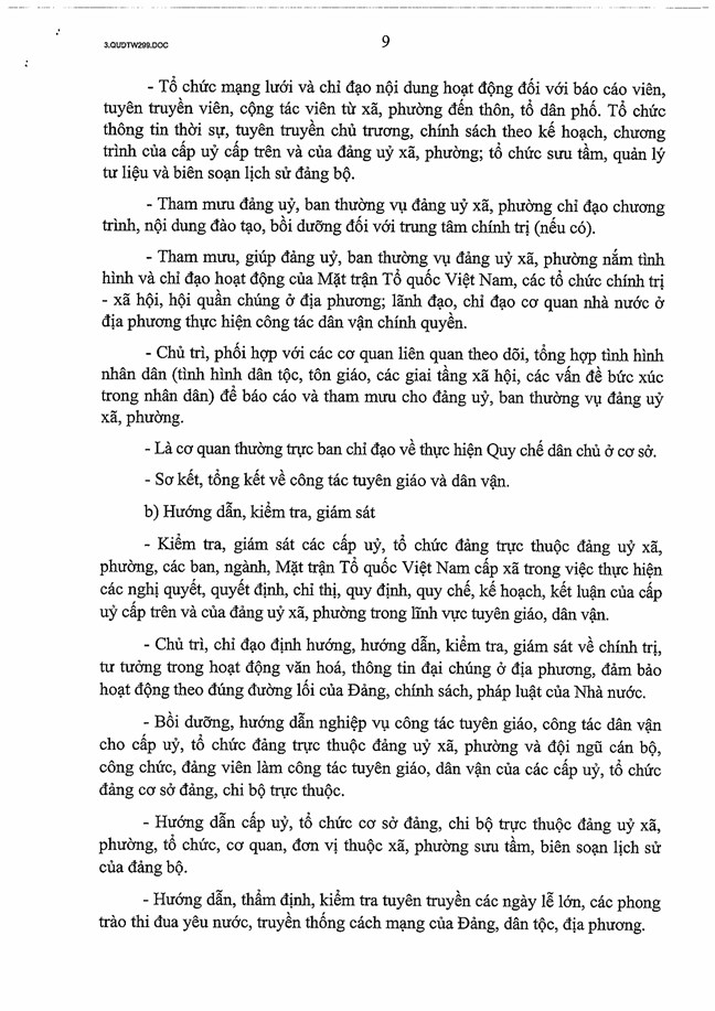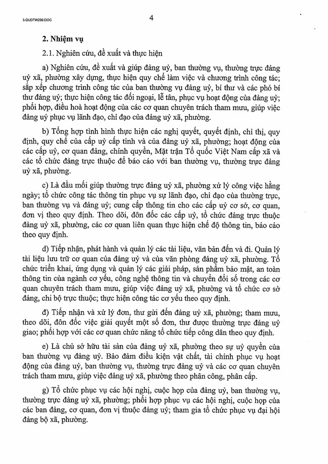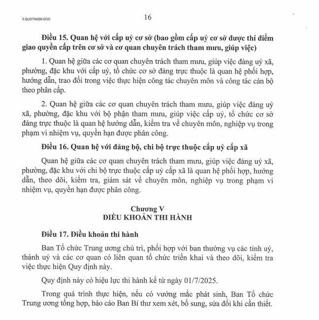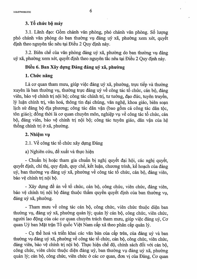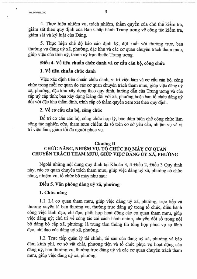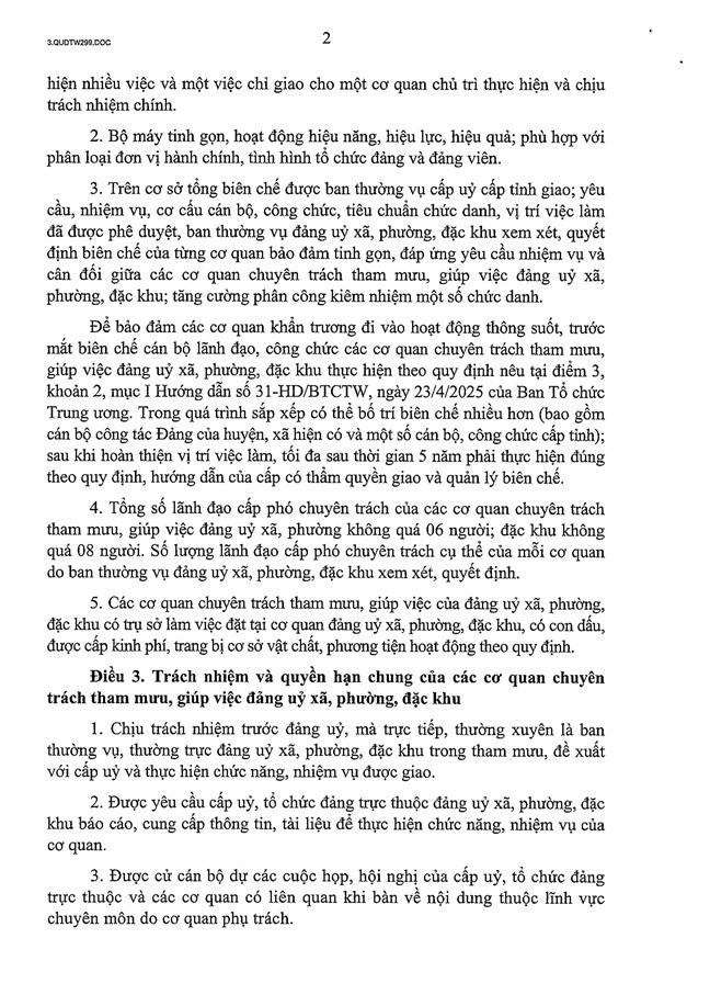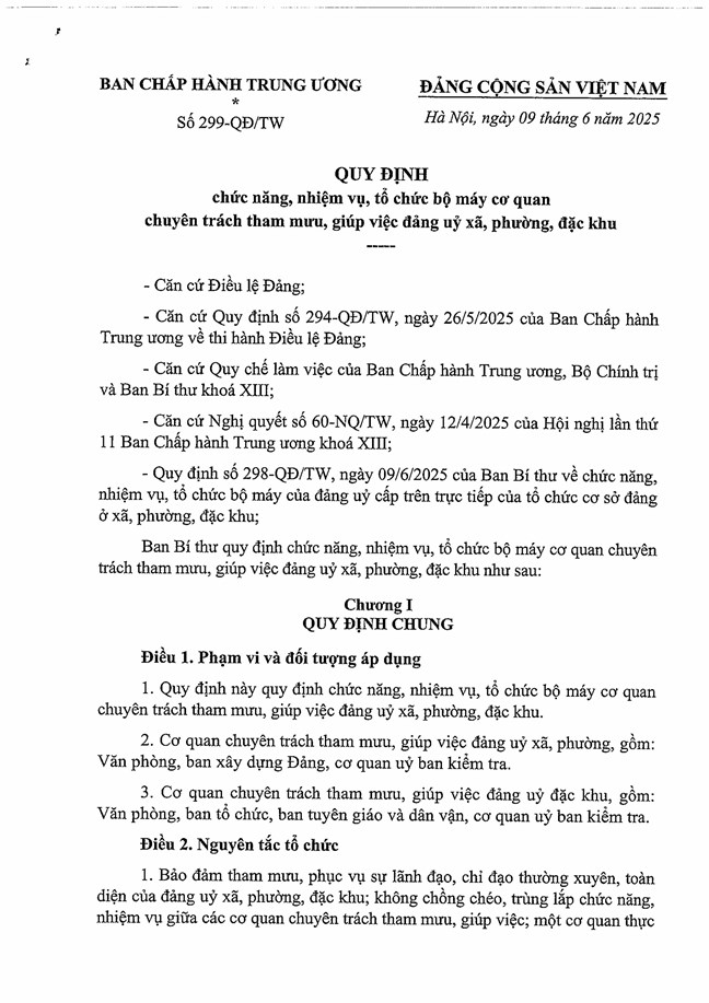 TOÀN VĂN: Quy định số 299-QĐ/TW chức năng, nhiệm vụ, tổ chức bộ máy cơ quan chuyên trách tham mưu, giúp việc đảng uỷ xã, phường, đặc khu