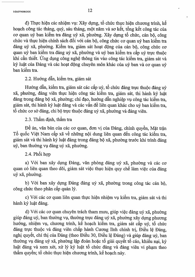 Trong phạm vi lĩnh vực công tác, các cơ quan chuyên trách tham mưu, giúp việc Đảng ủy xã, phường, đặc khu chủ trì, phối hợp với Cơ quan Ủy ban MTTQ Việt Nam cấp xã triển khai thực hiện các nghị quyết, chỉ thị, quy định, quyết định, quy chế của cấp trên và cấp mình. Phối hợp nghiên cứu, hướng dẫn triển khai nghị quyết, chỉ thị, quy định, quyết định, quy chế và kiểm tra, giám sát theo chức năng, nhiệm vụ được đảng ủy, ban thường vụ Đảng ủy xã, phường, đặc khu giao.