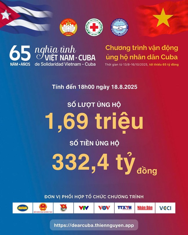 (Mặt trận) - Tính đến 18h00 ngày 18/8, Chương trình vận động ủng hộ nhân dân Cuba “65 năm nghĩa tình Việt Nam - Cuba” đã nhận được sự hưởng ứng nồng nhiệt của hàng triệu trái tim Việt Nam, với số tiền ủng hộ hơn 332,4 tỷ đồng.