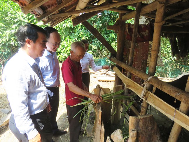 | Phó Chủ tịch Thường trực Ủy ban MTTQ tỉnh Phú Yên Hồ Hồng Nam (bìa trái) và Chủ tịch UBND huyện Tây Hòa Trần Minh Trí (thứ 2 từ trái sang) kiểm tra thực tế tại một hộ nghèo được nhận kinh phí hỗ trợ để chăn nuôi bò. Ảnh: THÚY HẰNG |